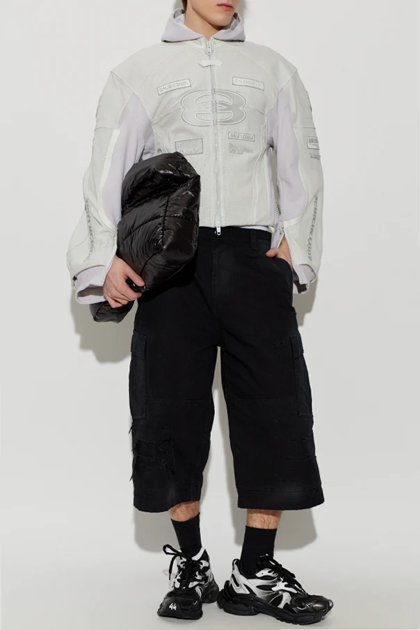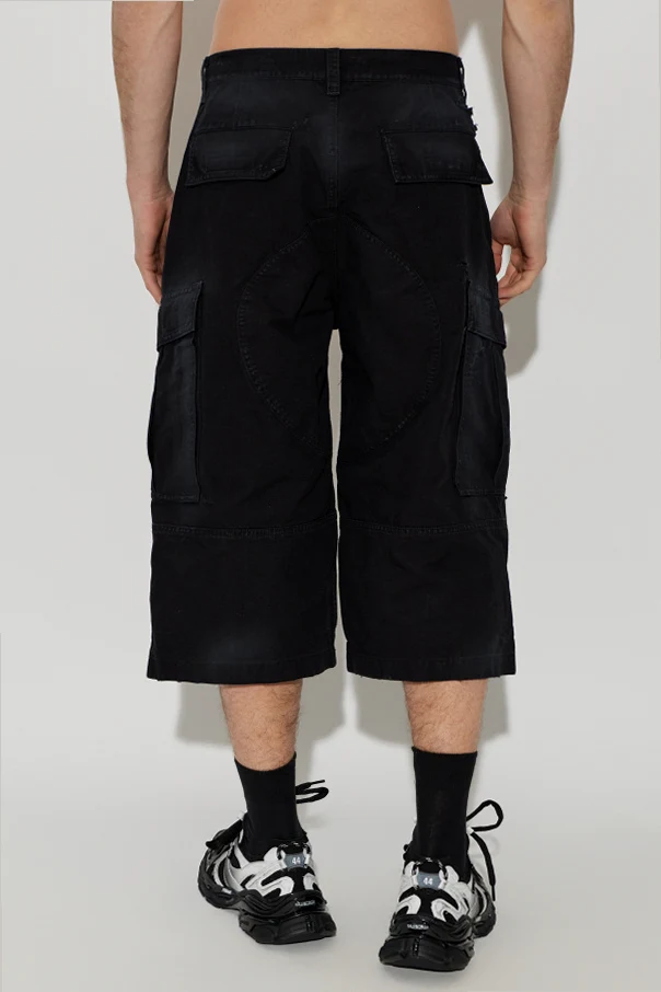 Step into understated sophistication with these cargo shorts in a deep, classic black. Thoughtfully crafted by Balenciaga , this striking piece impresses with its voluminous silhouette, relaxed fit, and subtly deconstructed touches. The dense, textured cotton material ensures resilience and comfort, while its unique finish—featuring deliberate abrasions, frayed details, and irregular slashes—evokes a bold industrial charm.