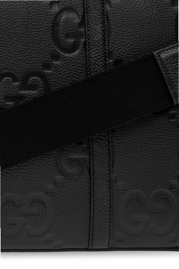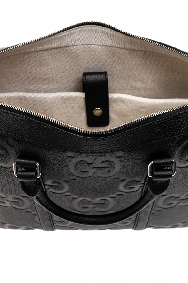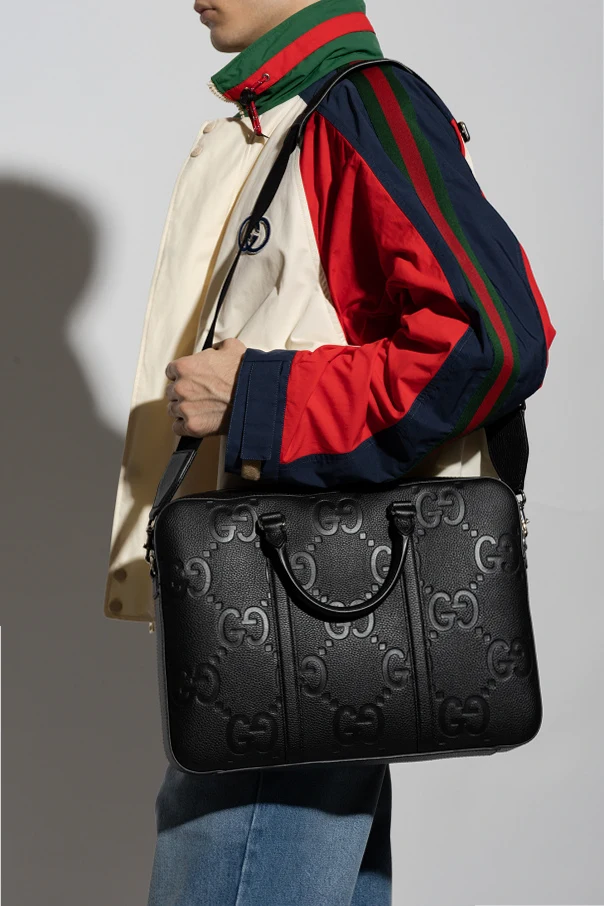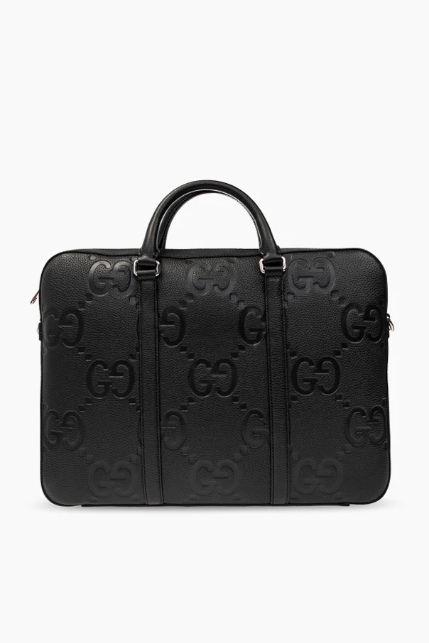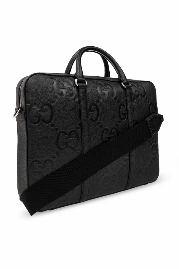Black briefcase from Gucci. Crafted from leather with an embossed Jumbo GG pattern, this model is complete with a two-way zip, two half-round handles, detachable and adjustable shoulder strap, silver-tone metal hardware and one internal compartment with one snap-fastened pocket and one zip pocket.