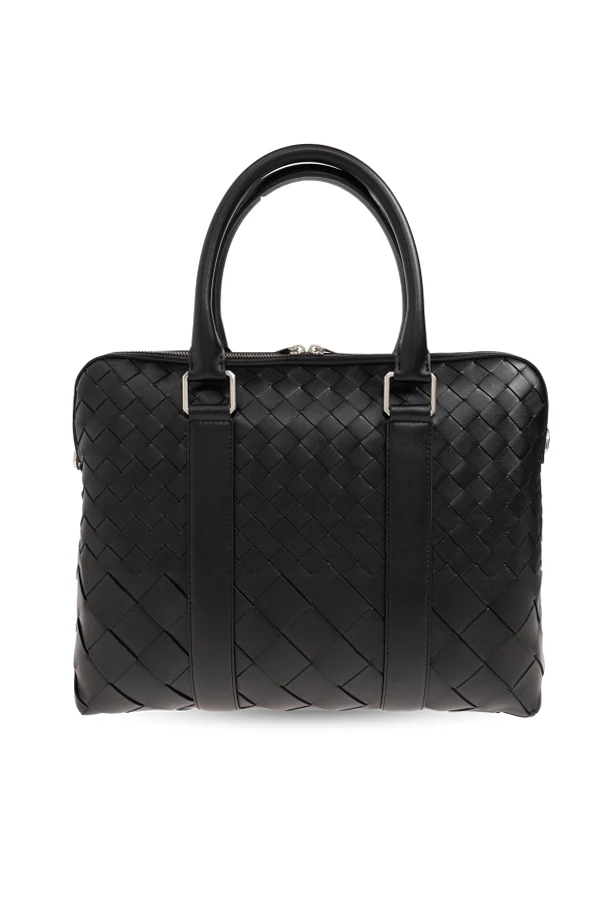 Black briefcase from Bottega Veneta. Made of calf leather accentuated with the brand's signature Intrecciato weave, this design fastens via a two-way zip and features a detachable and adjustable shoulder strap, two half-round handles, silver-tone metal hardware and one internal compartment with one zip pocket and two slip pockets.