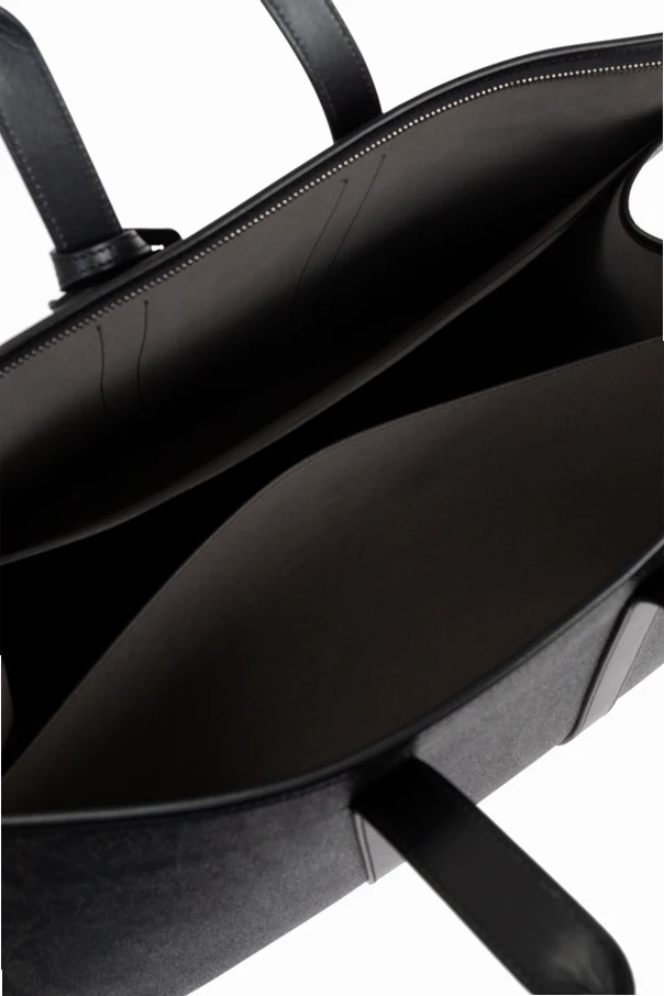 Details include a sleek, adjustable shoulder strap adorned with the brand's logo, an elegant leather handle for hand-carrying, and a secure zipper closure with silver-toned metal accents . Inside, the bag reveals a spacious compartment with two slip pockets, offering practicality for travel.