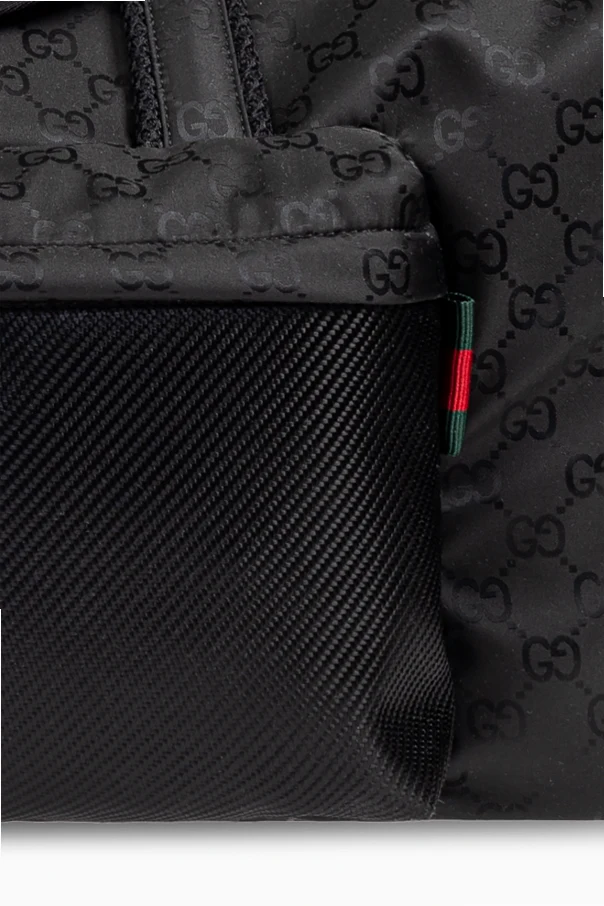 Crafted from robust synthetic material, likely nylon, with exquisite carbon fiber accents on the front pocket, this bag is both durable and luxurious. The dominant black hue exudes elegance, complemented by a distinctive green and red stripe, echoing the brand's iconic elements.
