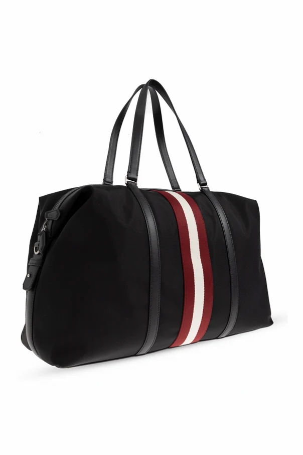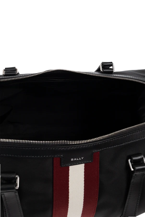 The commanding black exterior is eloquently accented by two bold, vertical stripes—deep crimson and pristine white—gracing the center front, while meticulously reinforced leather trims and handles speak to the meticulous Swiss craftsmanship synonymous with Bally since 1851. High-performance technical fabric resists stains and moisture, ensuring enduring beauty through every journey.
