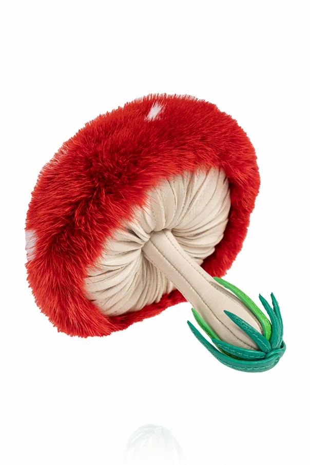 The Mushroom Charm Keychain by Fendi exudes whimsical sophistication, artfully blending playful design with exquisite Italian craftsmanship. This miniature masterpiece captivates with its plush, rounded red cap—adorned with pure white, irregular spots atop luxurious faux fur—evoking the enchanting allure of a storybook toadstool. Its elongated, cream-toned stem mimics natural textures, while green leather-inspired details at the base create the illusion of fresh grass or leaves.