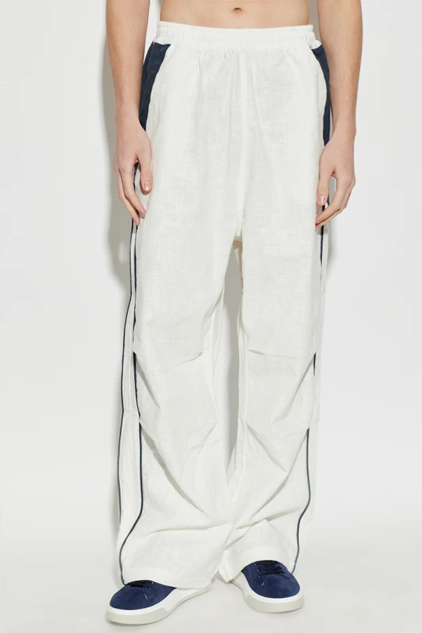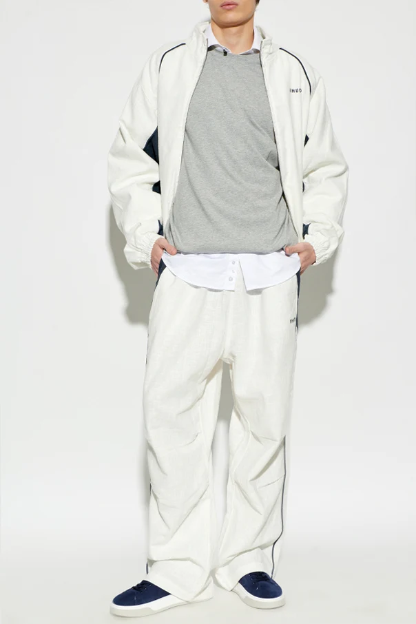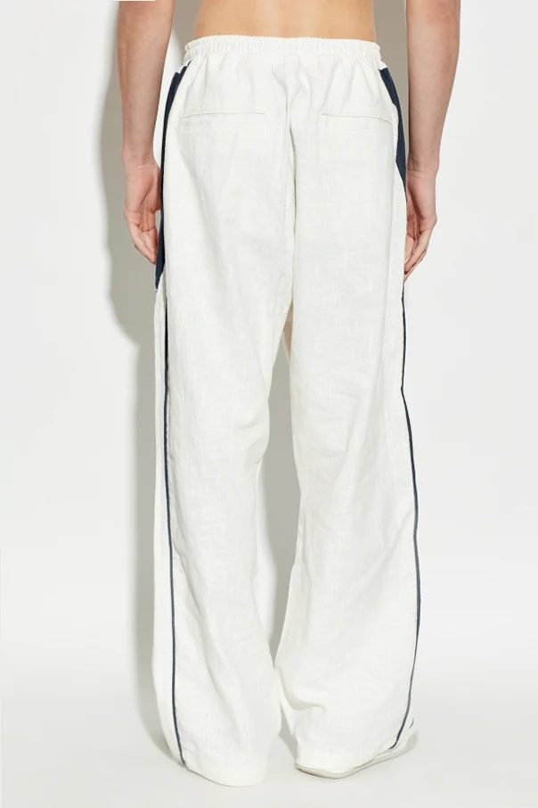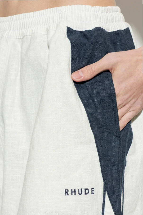 Dominated by a crisp white hue and accented with striking navy blue side panels, these pants visually elongate your figure and infuse a fresh, sporty edge. Discreetly embroidered with the designer’s signature RHUDE logo near the side pocket, each detail attests to a devotion to luxury and urban sophistication. With both front and back pockets, these pants elegantly balance practicality with elevated design.