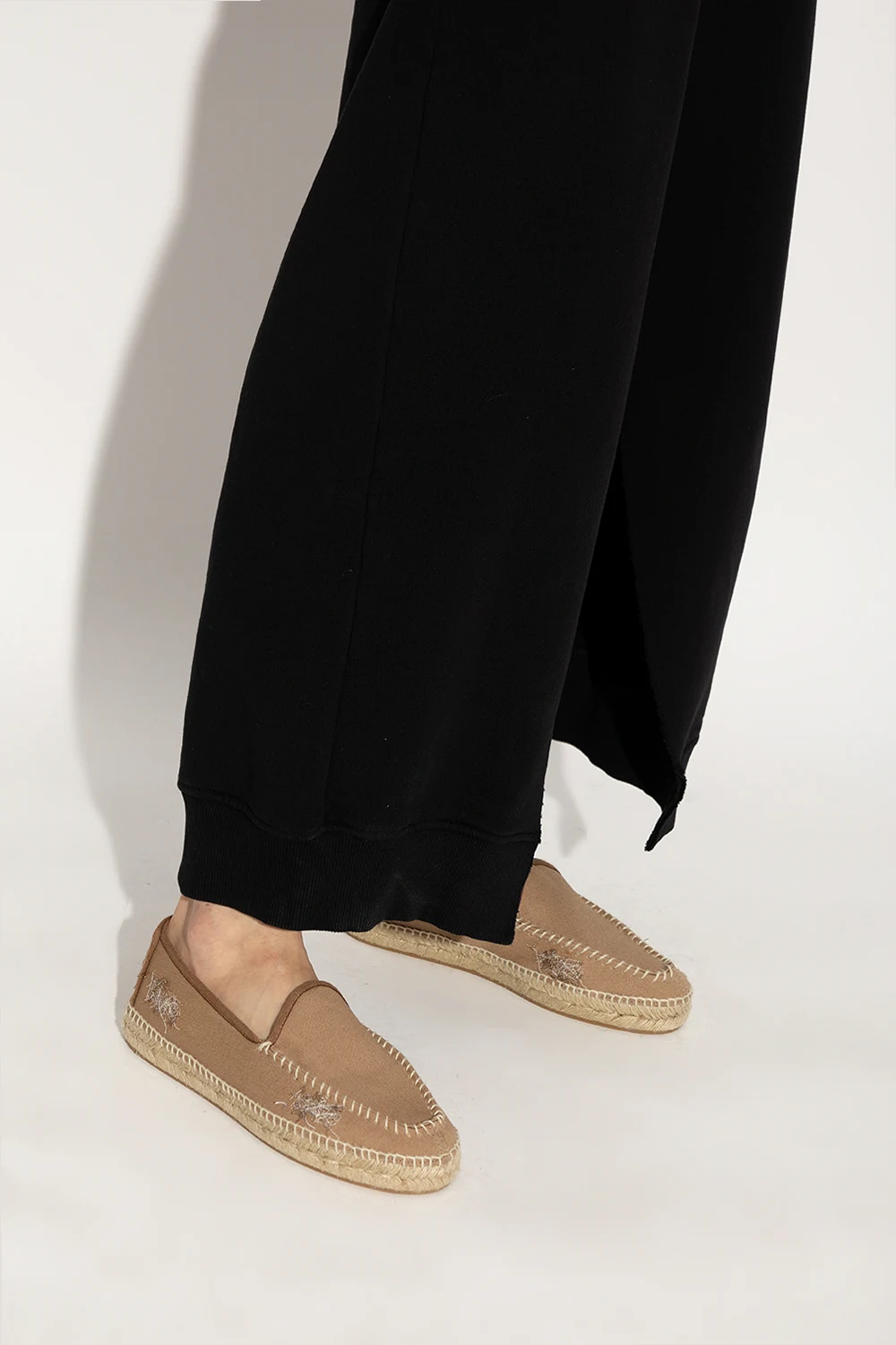 Beige espadrilles from Maison Margiela. Crafted from fabric, this model sits on a beige rubber sole with a jute overlay and showcases decorative stitching details.