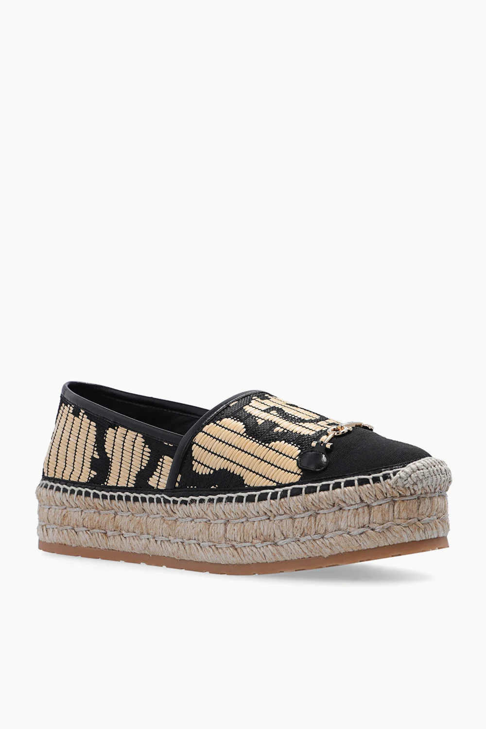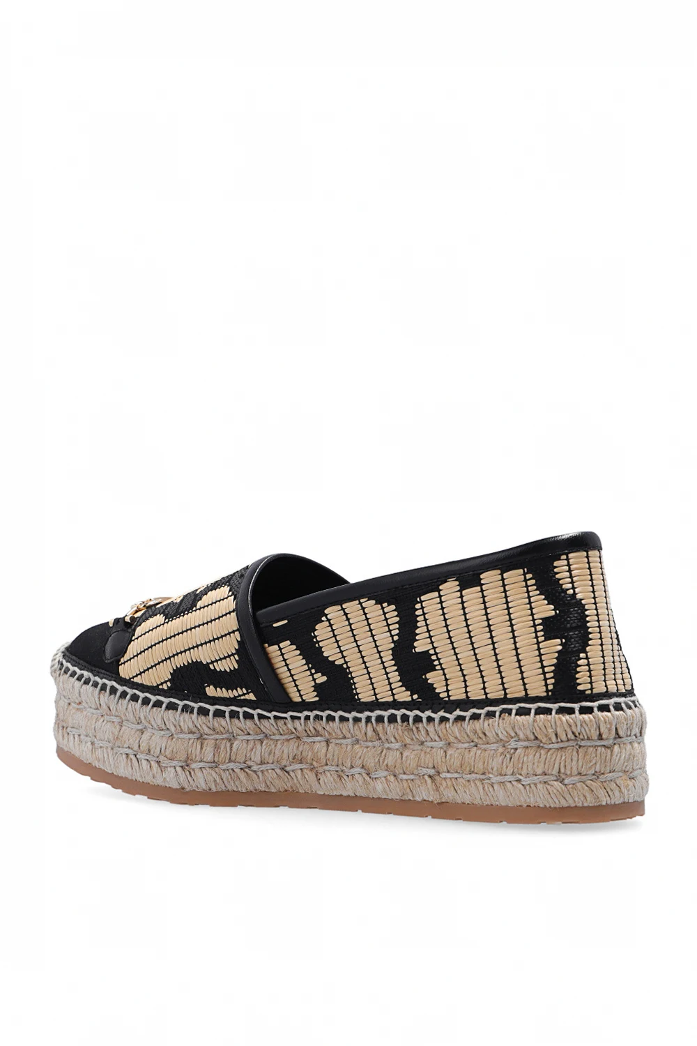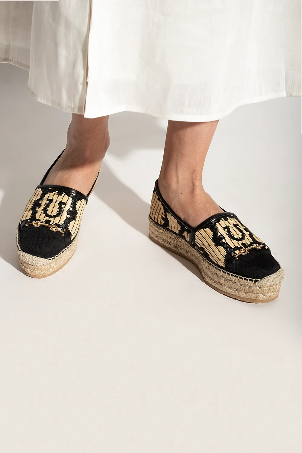 Black and beige platform espadrilles from Salvatore Ferragamo. Crafted from calf leather and woven straw embroidered with the Gancini pattern, this model features the brand's signature Gancini hardware on the front and a beige rubber sole with a jute overlay.