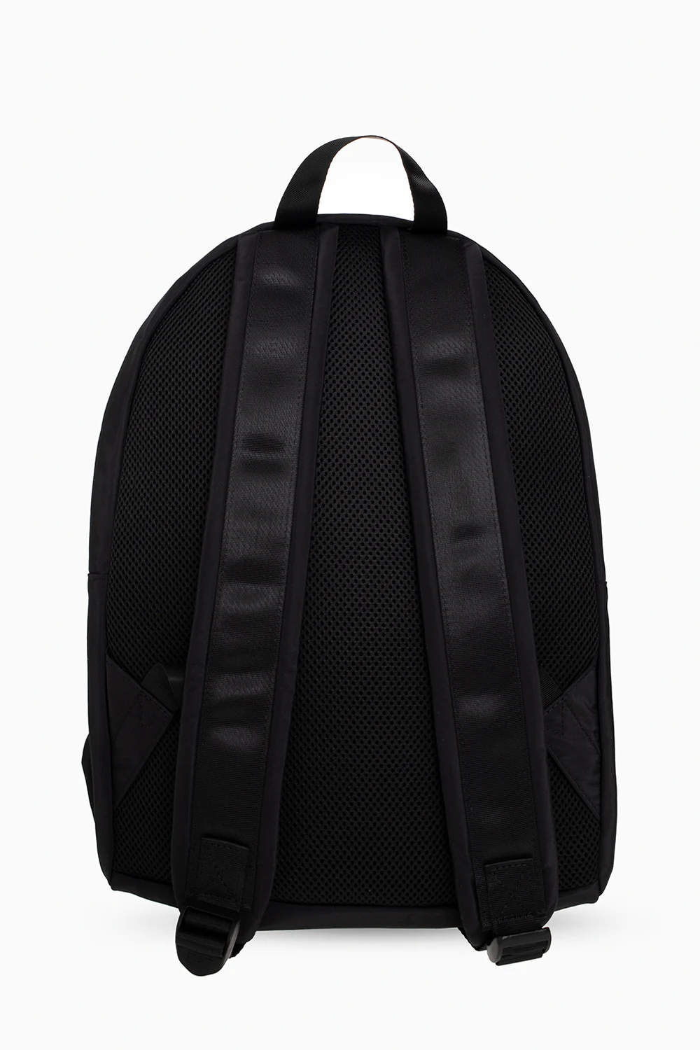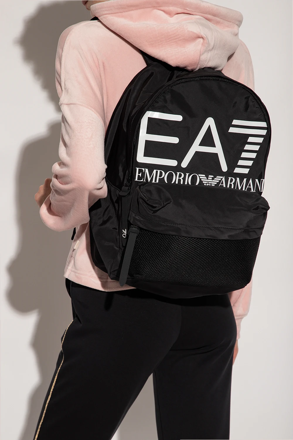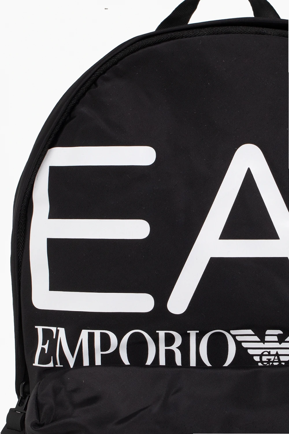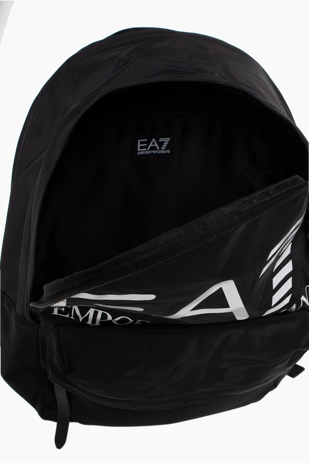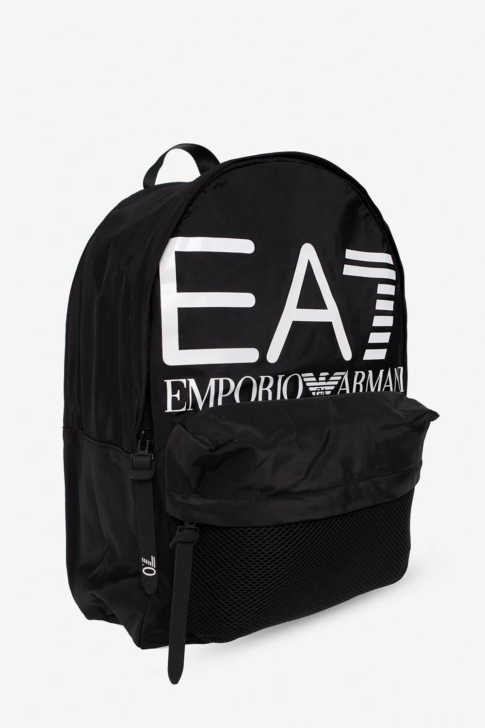 Black backpack from EA7 Emporio Armani. Assembled from different fabric panels, this design features a zip fastening, a white logo print, a zip pocket on the front, a half-round handle, adjustable shoulder straps and one internal compartment with a zip pocket.