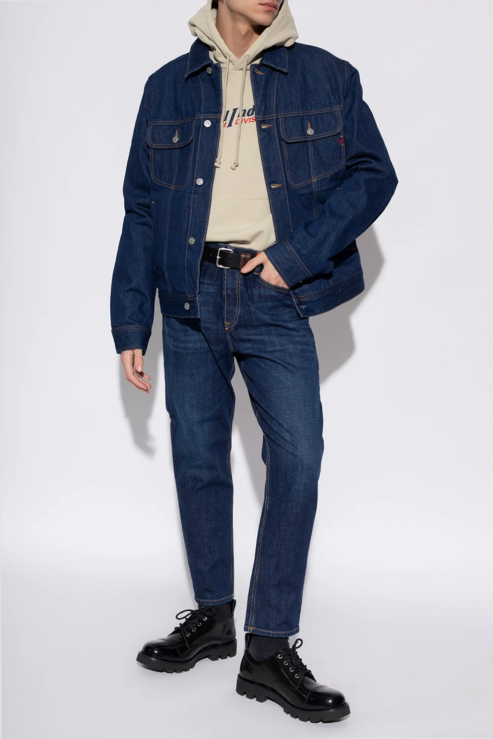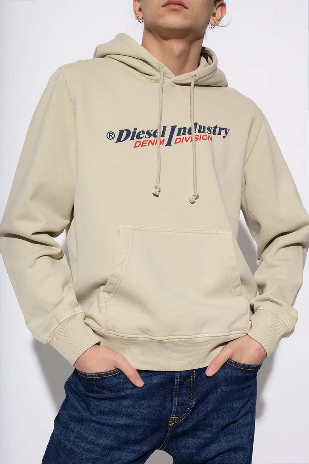 Beige 'S-Ginn' sweatshirt with a drawcord-adjustable hood from Diesel. Made of cotton jersey, this style features a navy blue and red logo on the front, a kangaroo pocket and a ribbed bottom hem and cuffs.