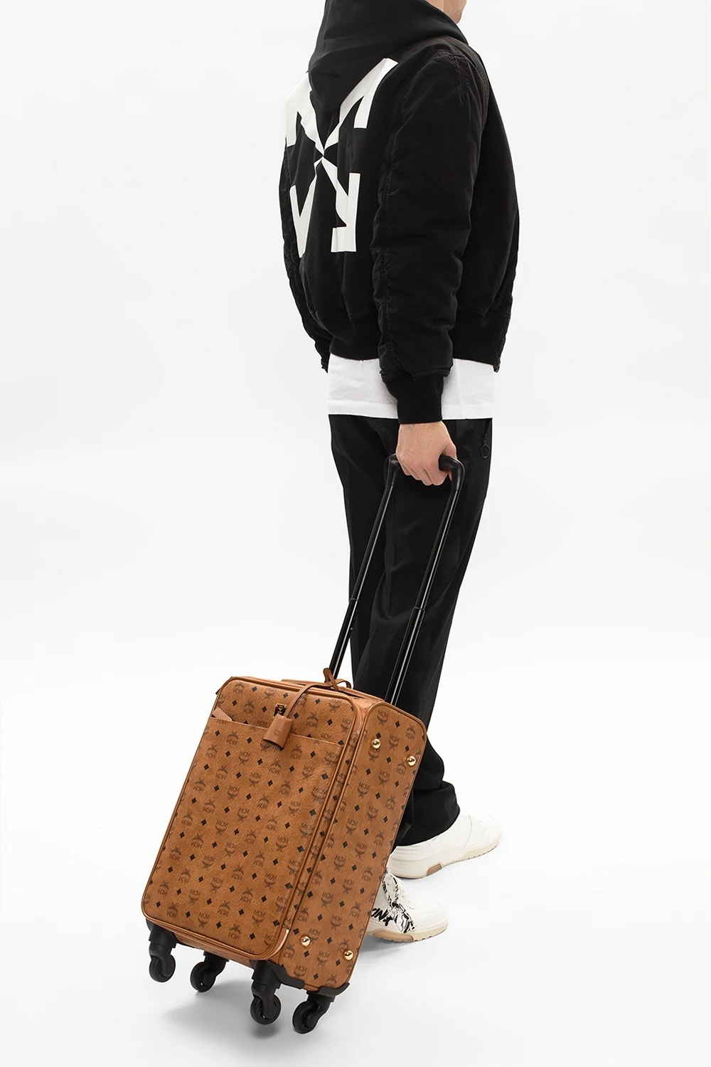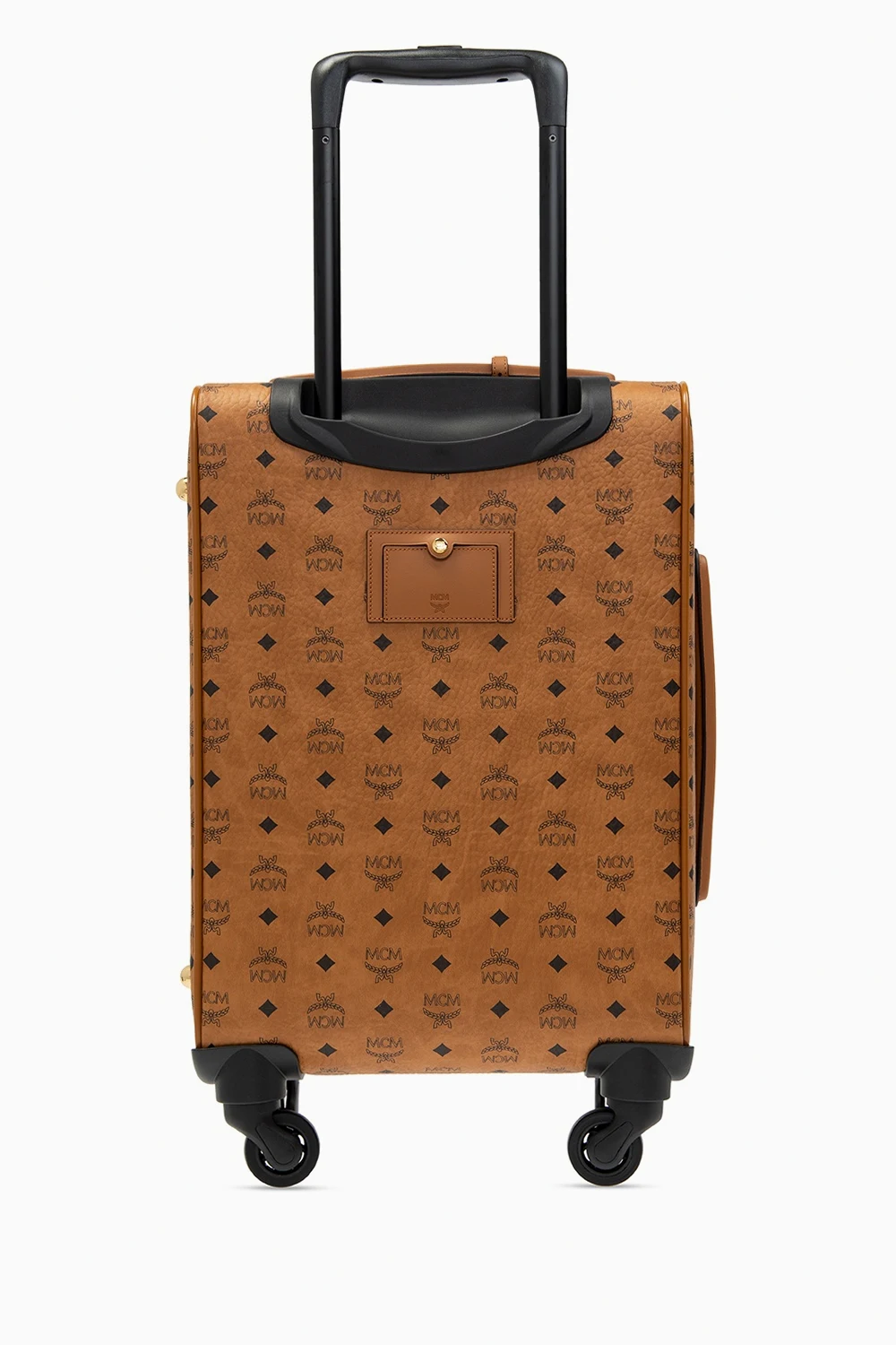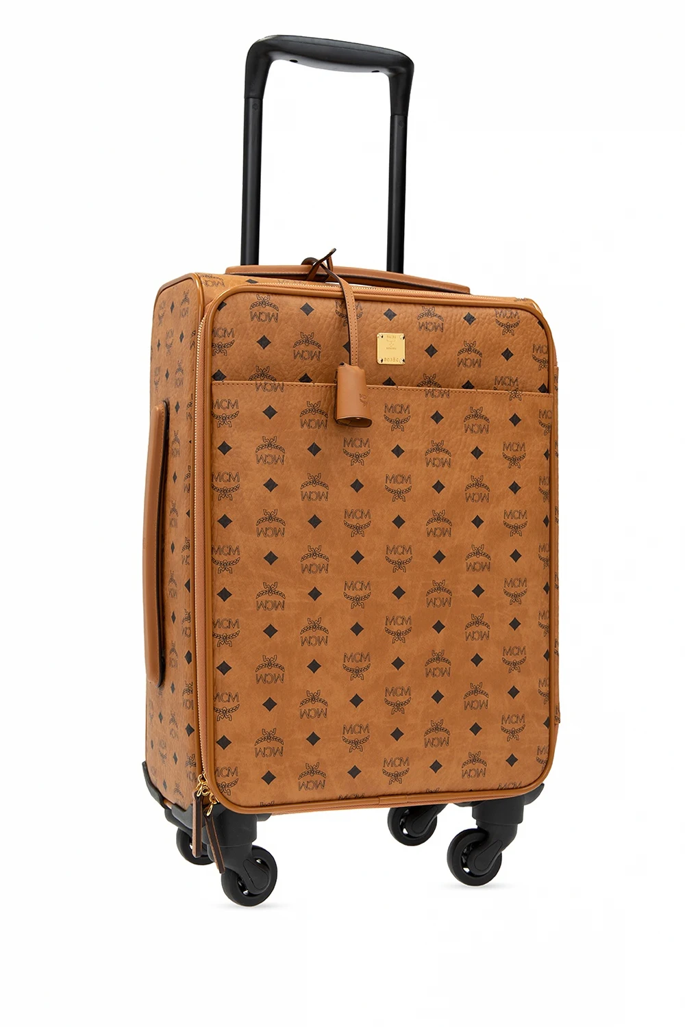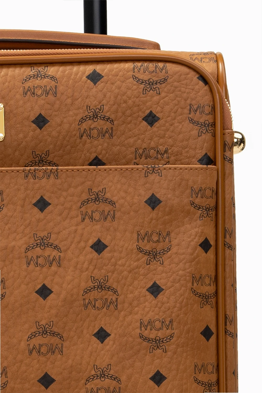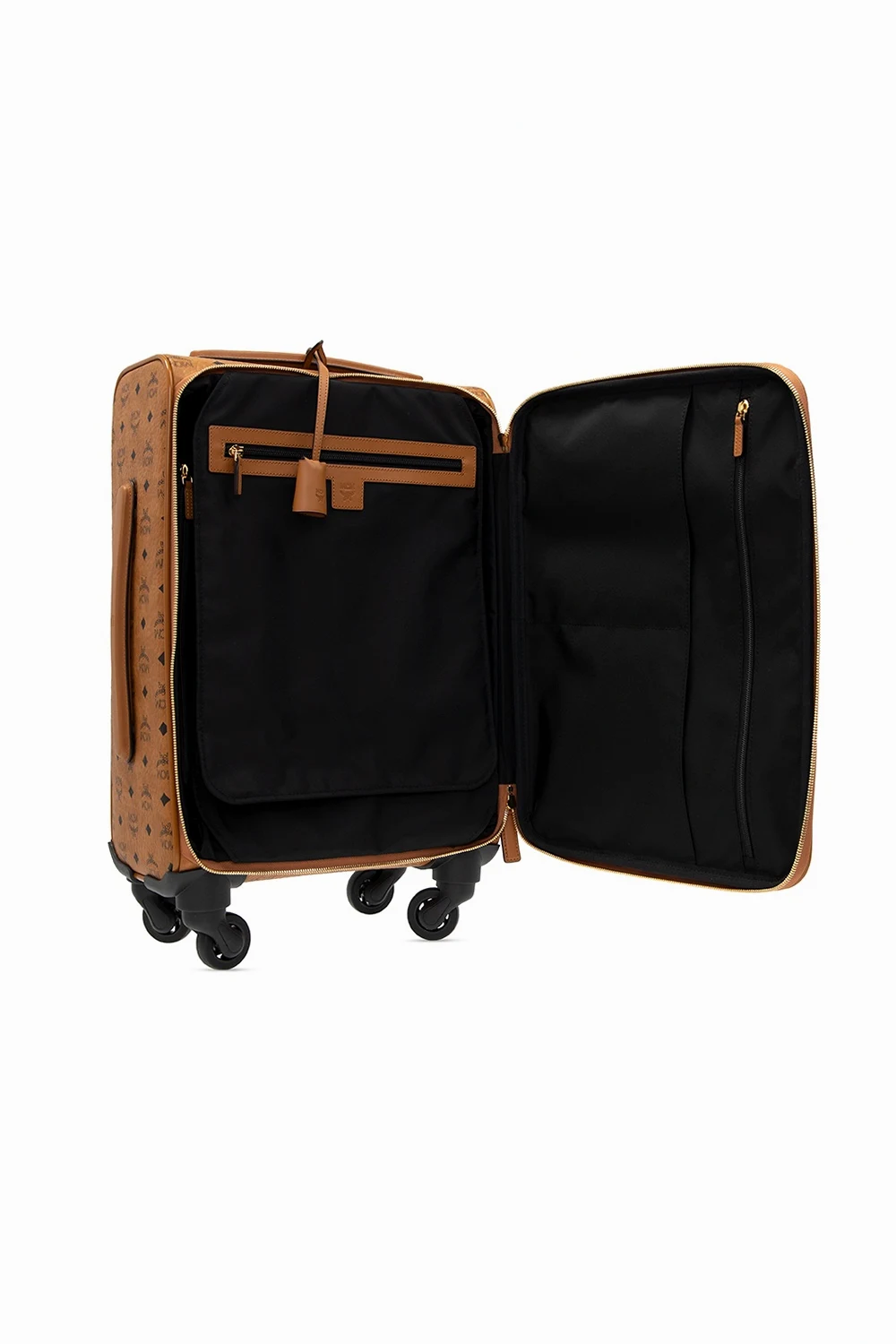 Brown suitcase from MCM. Crafted in the label's signature coated canvas and leather, this design flaunts a black monogram print and branded hardware. It is complete with a two-way zip fastening with a keyed padlock, an external zip pocket on the front and a snap-fastened pocket on the back, three half-round handles (including a retractable one), four rotary wheels, gold-tone metal hardware and interior with one compartment, three zipped pockets and two slip pockets. Item comes in a protective case.