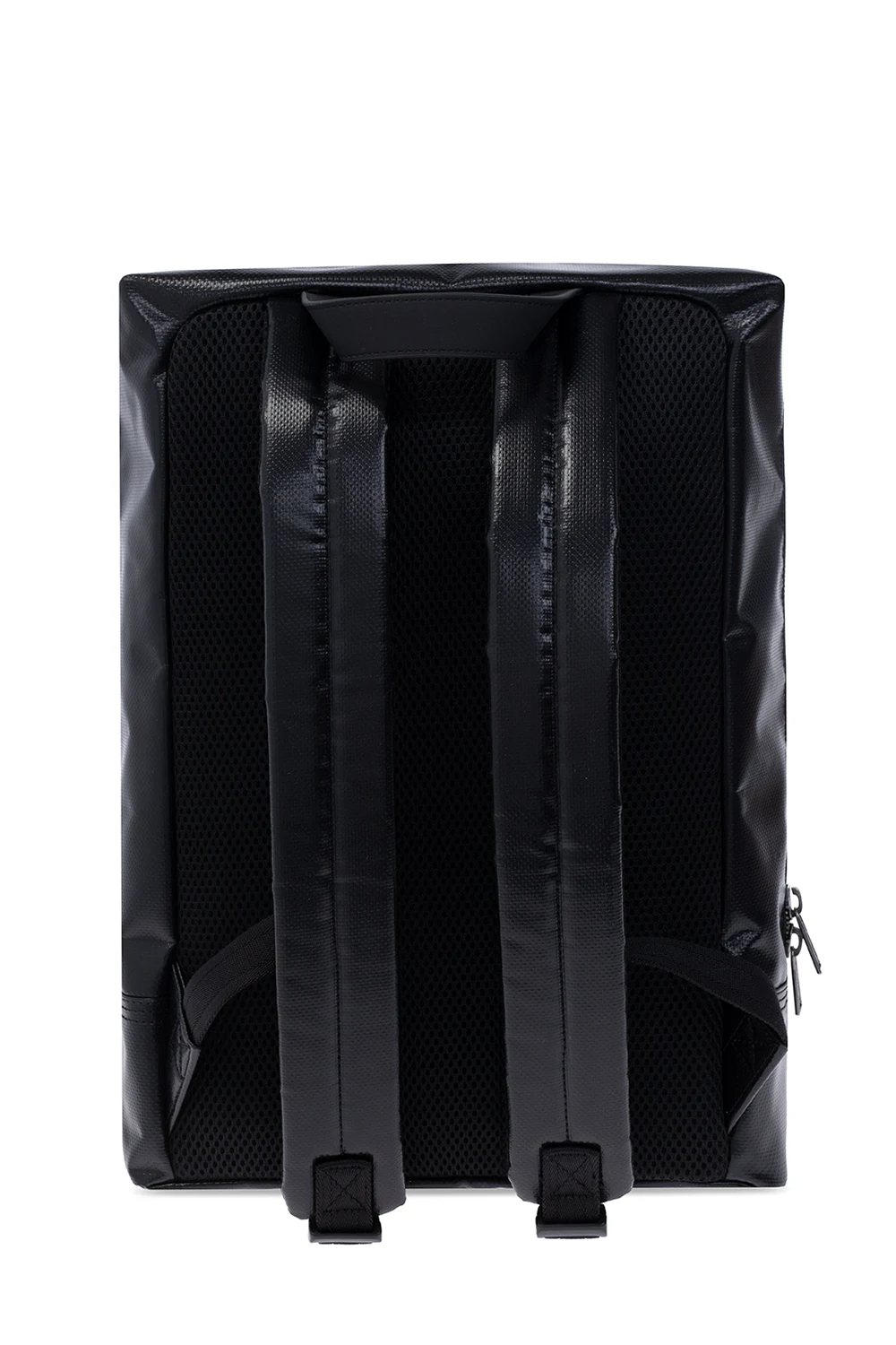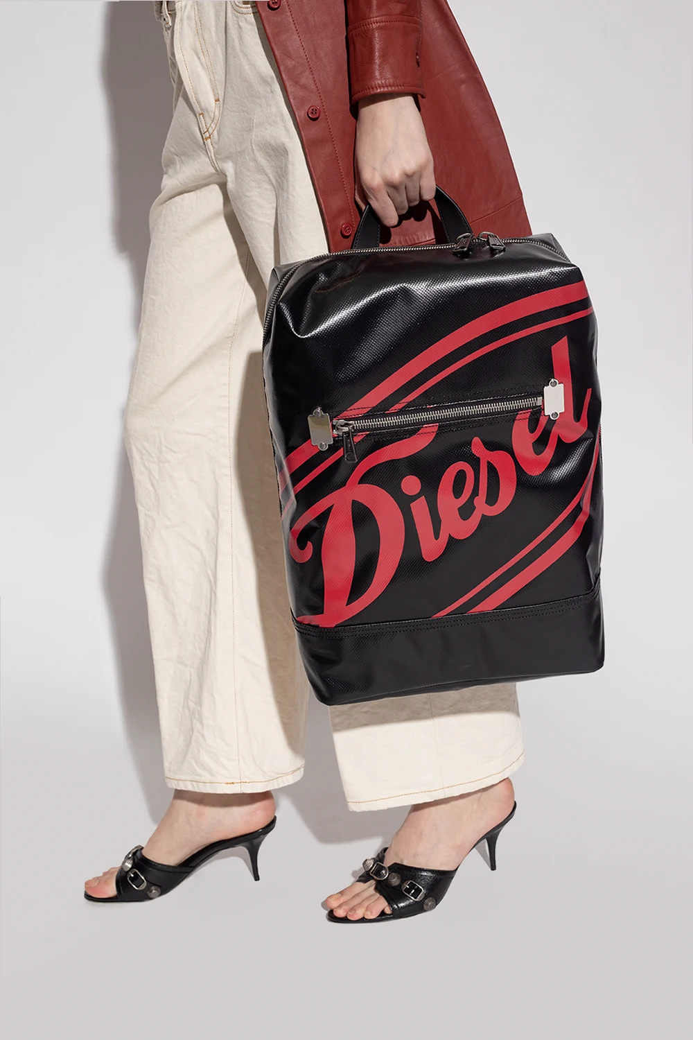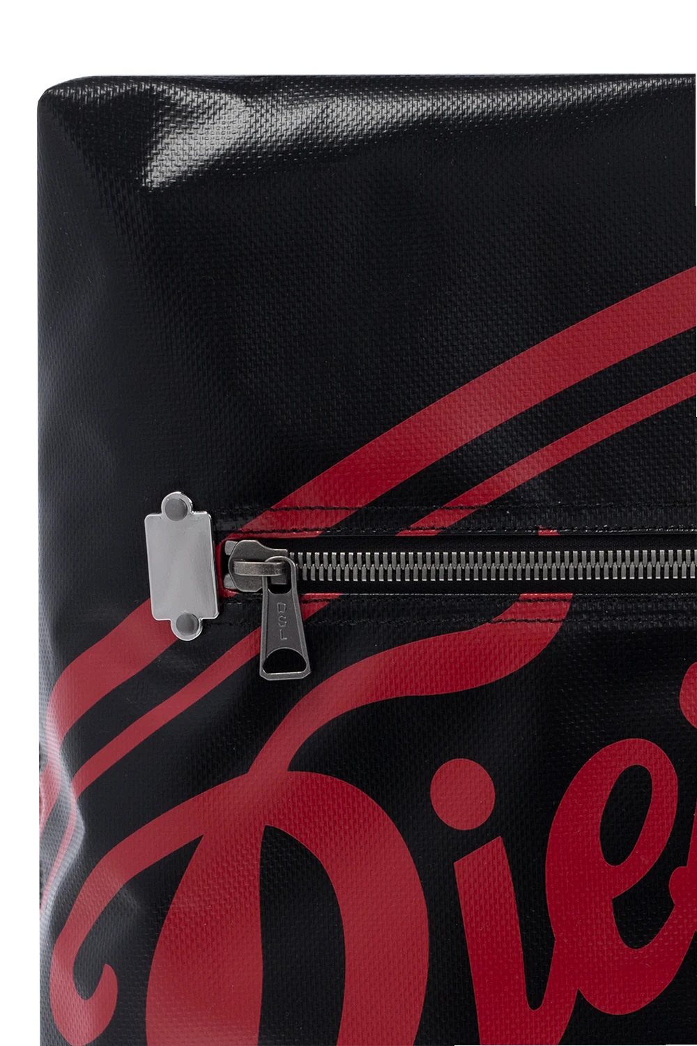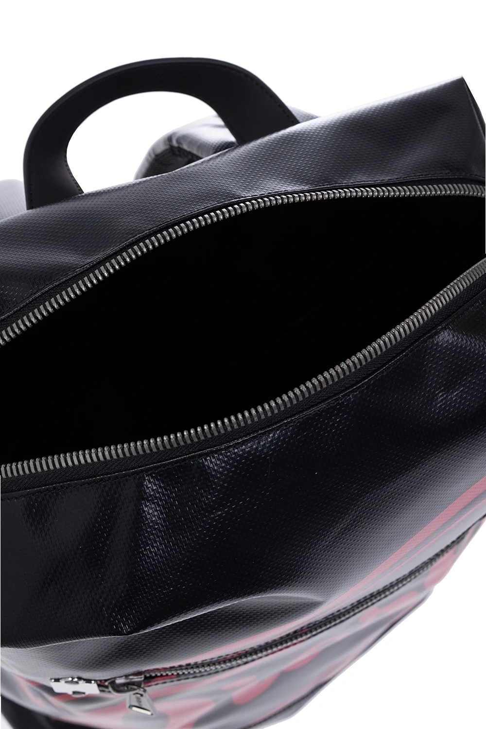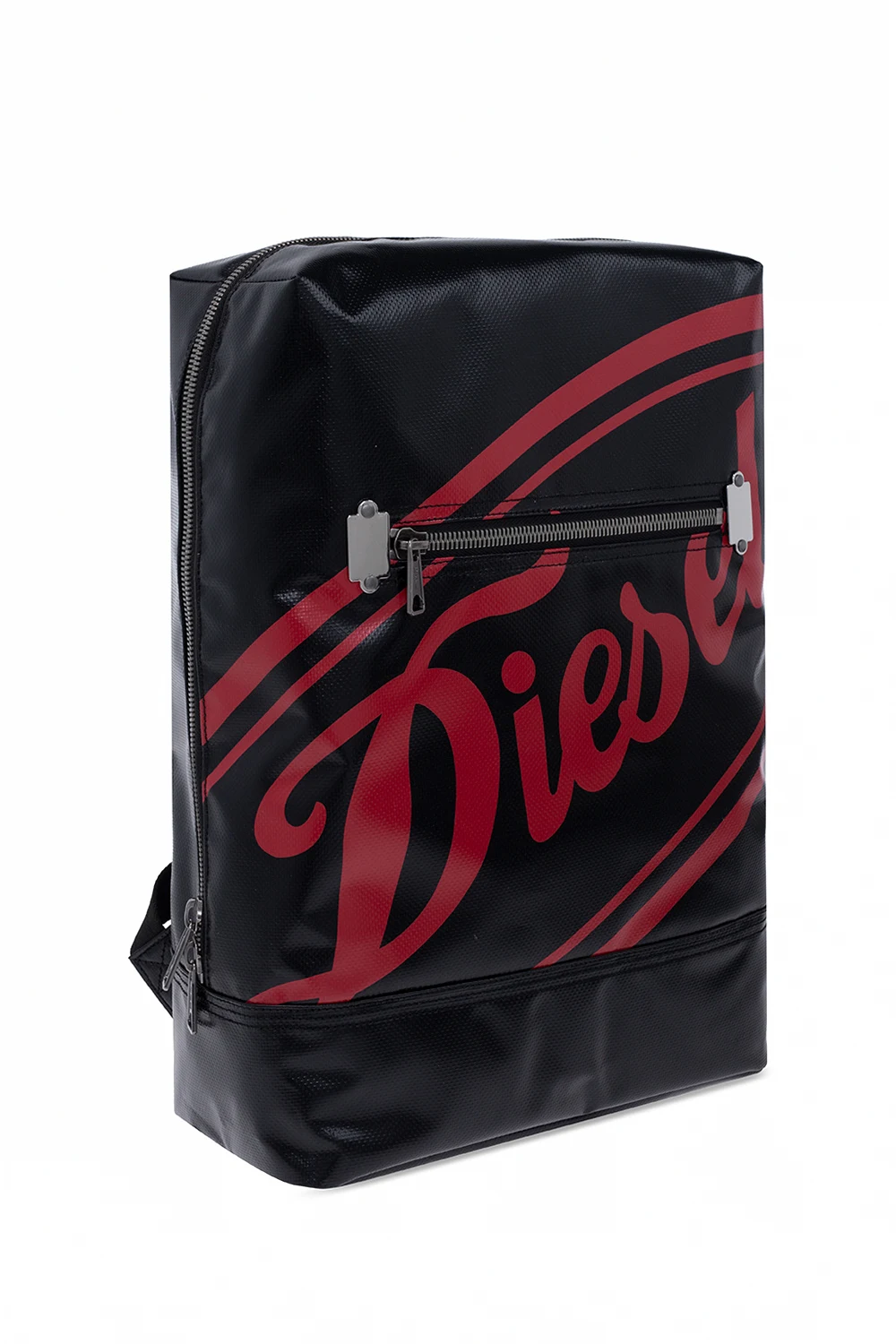 Black ‘Charly’ backpack from Diesel. Made of waterproof tarpaulin inspired by military protective clothing. Fastened with a two-way zip, this model features a red logo with a faded effect, front zip pocket, perforated layer at the back, half-round handle, two adjustable shoulder straps, antique silver-tone metal hardware and one internal compartment with a laptop compartment and three slip pockets.