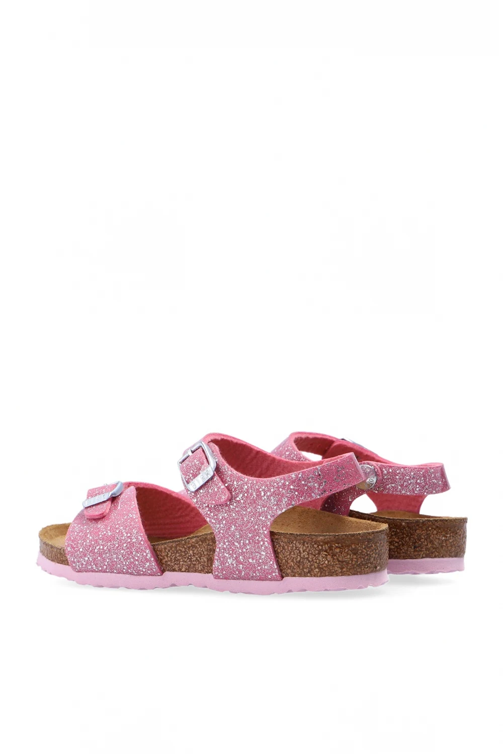 Pink ‘Rio Plain’ sandals from Birkenstock Kids. Crafted from a shimmering material, this pair sits on a pink rubber sole and features silver-tone logo-embossed buckle straps.