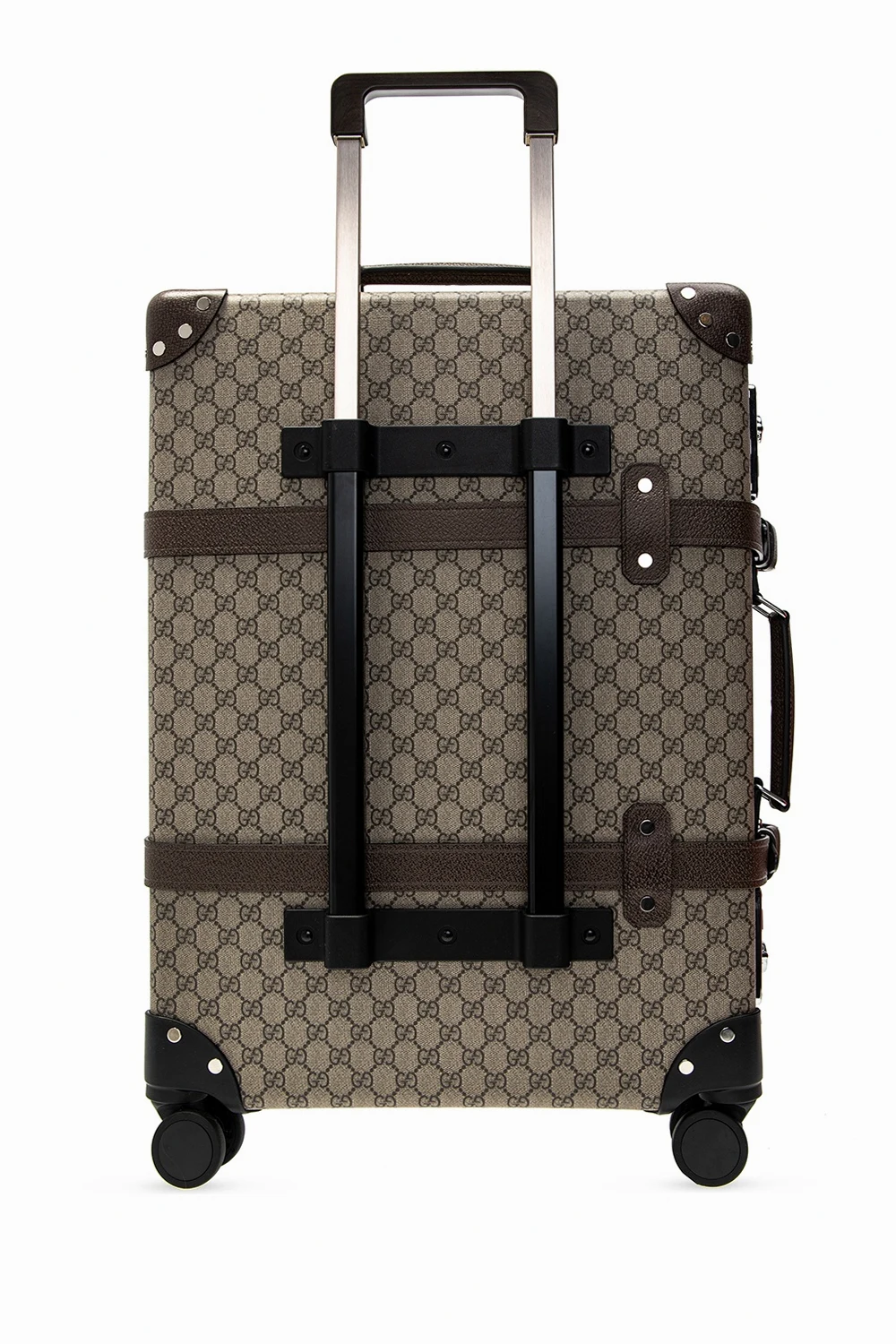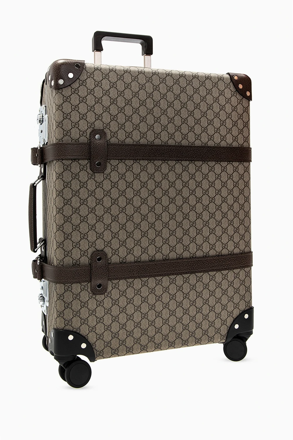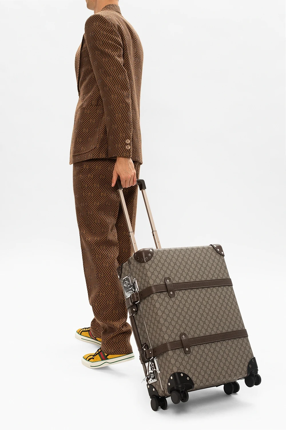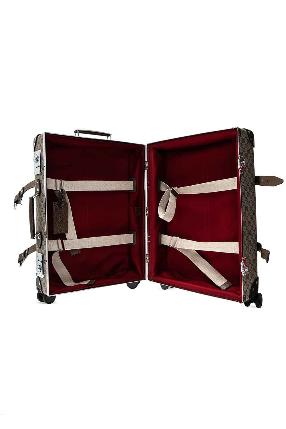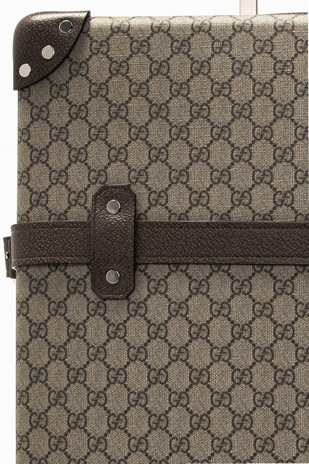 Beige and brown briefcase from Gucci. Crafted from the iconic GG Supreme canvas with leather trims, this item fastens with magnetic snaps in silver-tone and buckle straps. It is complete with two handles, including one adjustable, red lining and one internal compartment.