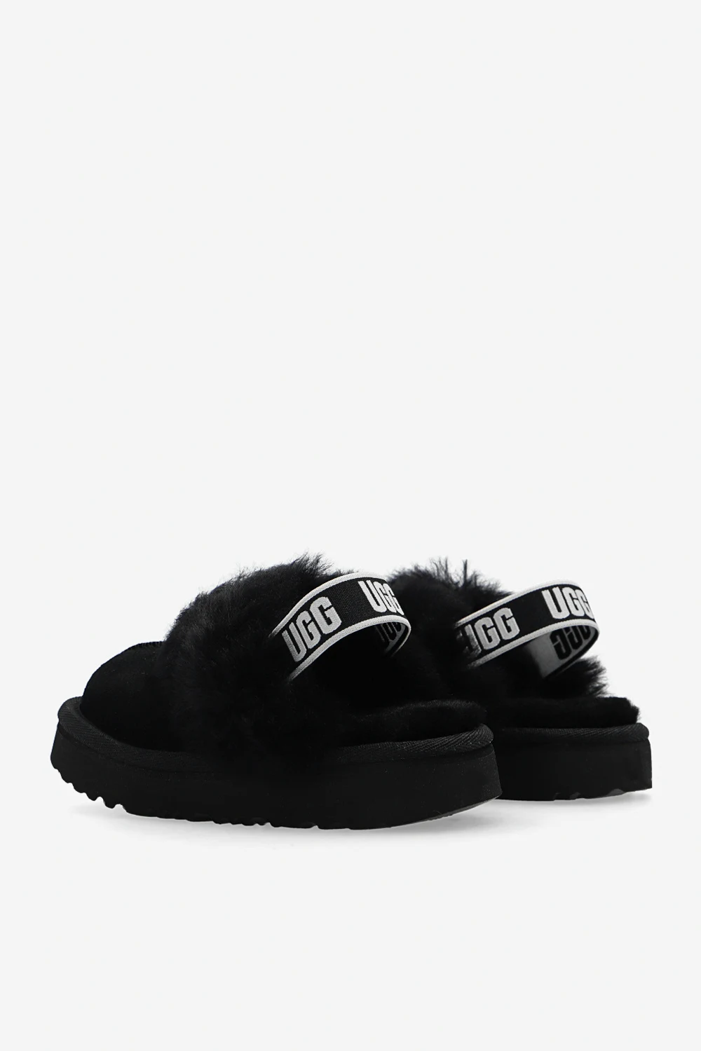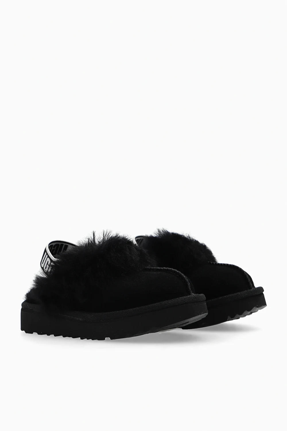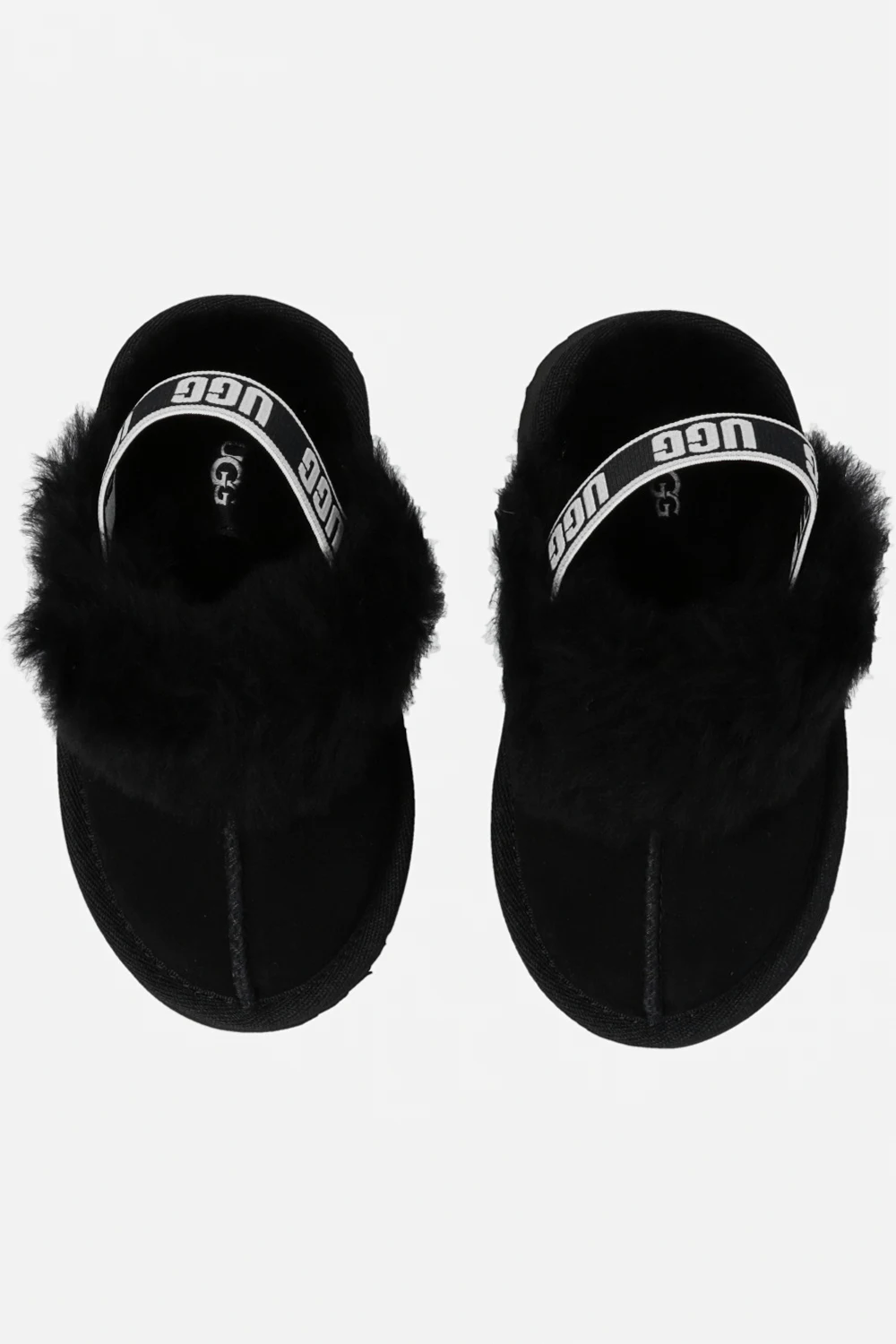 Black ‘Funkette’ slippers from UGG Kids. Crafted from suede with cream UGGPlush™ lining, this pair features an elastic black and white logo-embroidered strap and black sole made of EVA foam.