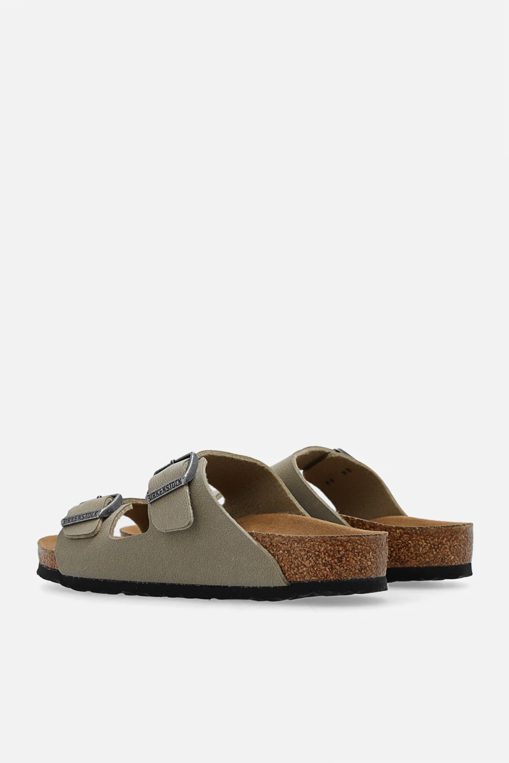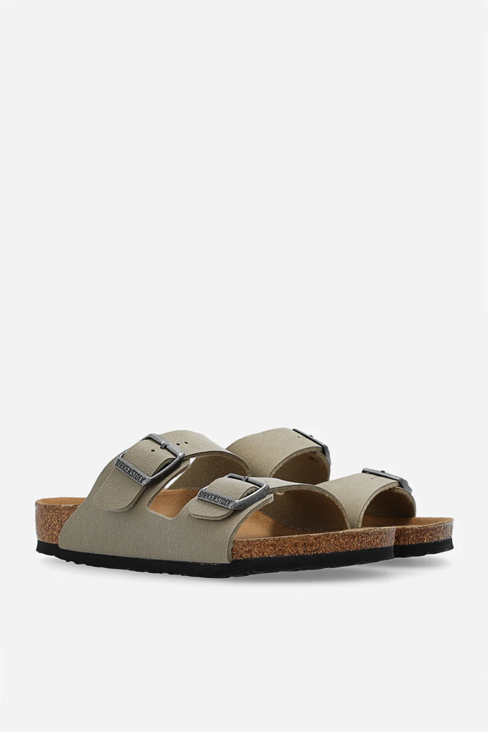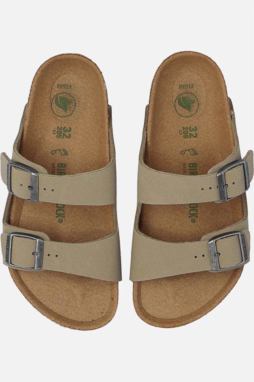 Greyish beige ‘Arizona’ slides from Birkenstock Kids. Made with durable Birkoflor®, this model features adjustable straps with dark silver-tone buckles, an embossed logo on the side, an anatomically shaped latex-cork footbed and a brown sole made of natural cork and black EVA foam. Vegan product.
