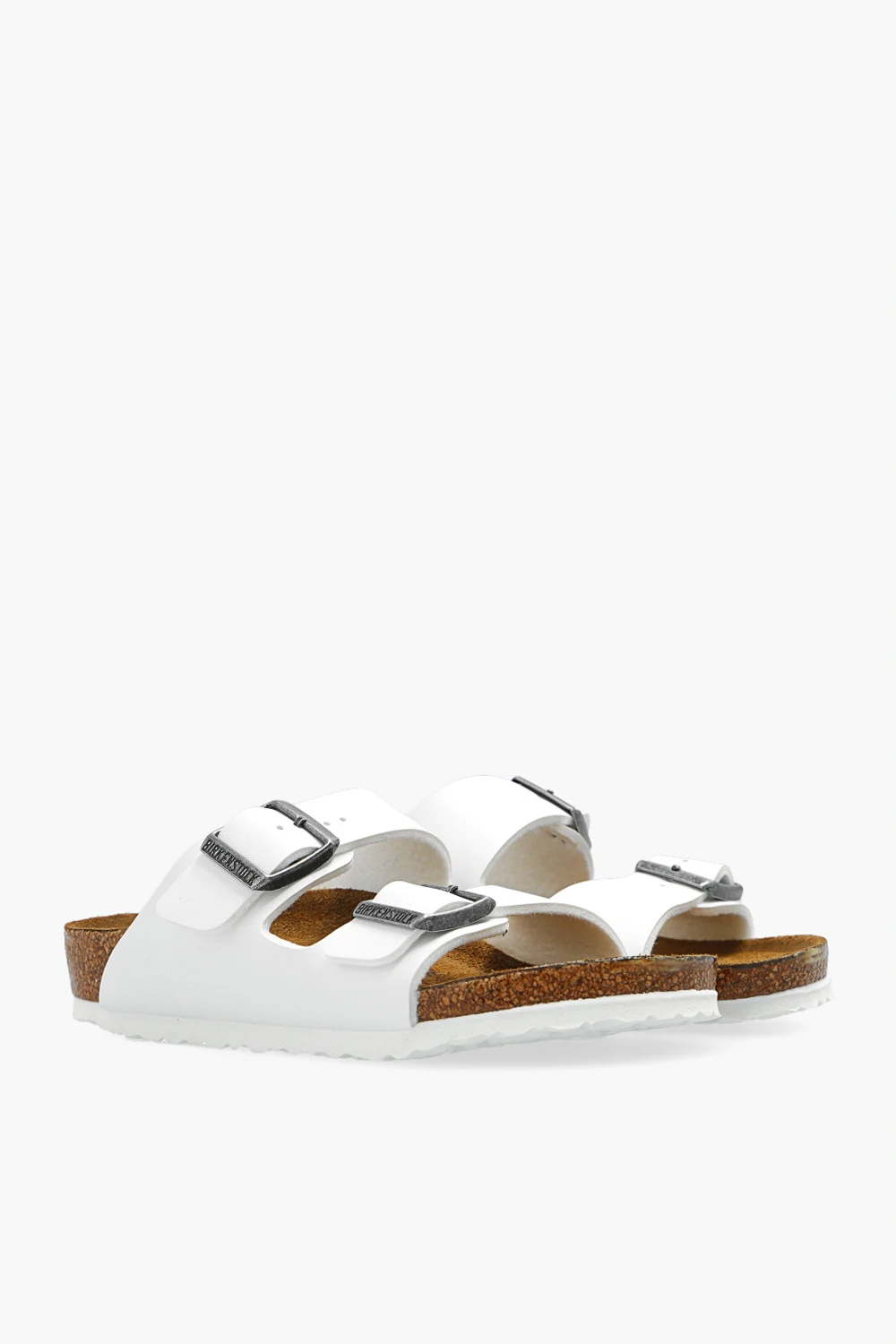 White ‘Arizona’ slides from Birkenstock Kids. Crafted with Birko-Flor®, this model sits on a white sole in EVA foam and cork and features straps with logo-embossed buckles in antiqued silver-tone.