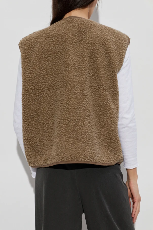 Experience understated sophistication with this teddy fleece vest from American Vintage . Crafted from exceptionally soft, plush fleece, it exudes warmth and an inviting tactile richness reminiscent of natural shearling. The vest features a classic, relaxed silhouette , designed without a collar and detailed with artfully rounded shoulders, offering timeless appeal and effortless versatility.