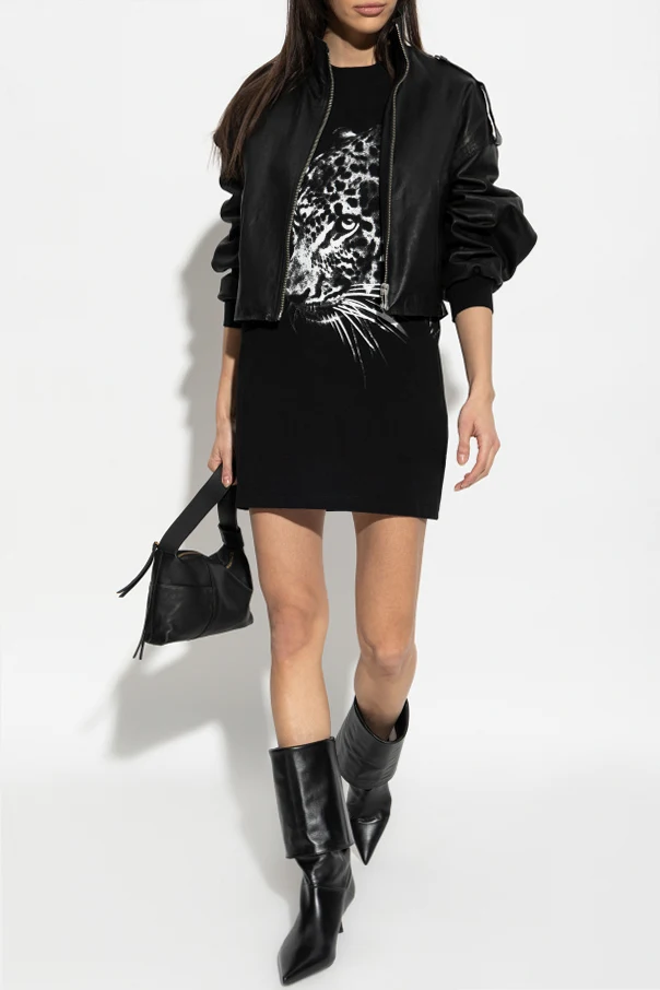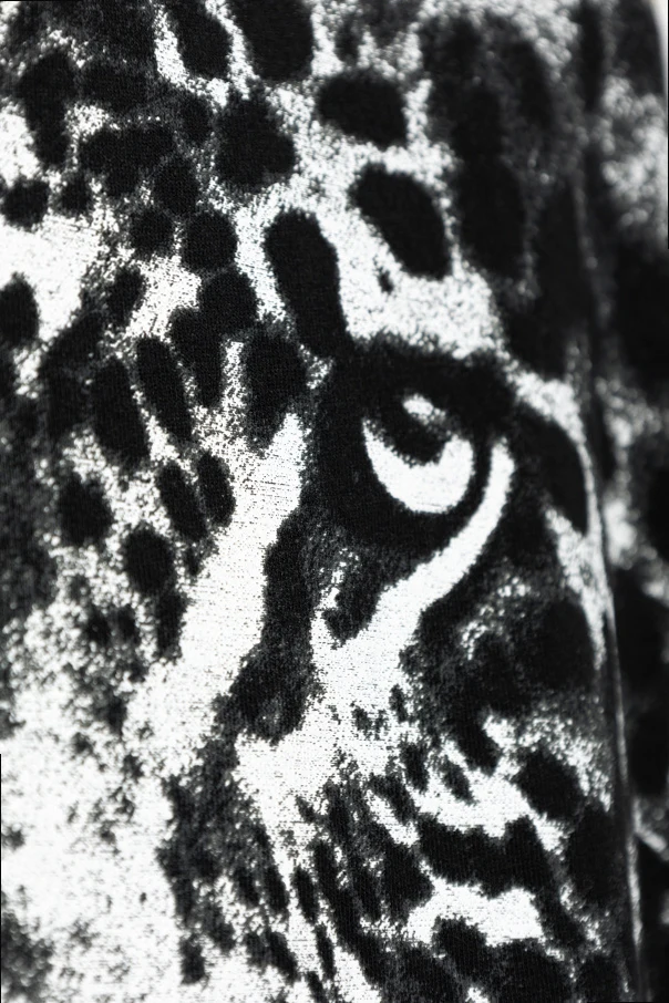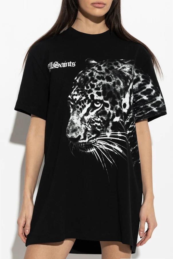 The front is beautifully punctuated by a sweeping, realistic leopard head print—a bold, contrasting motif that commands attention with its contemporary artistry. Discreetly placed above, the iconic AllSaints logo adds a signature of authenticity. The back is left unadorned, maintaining a sleek, modern profile for versatile daytime or evening styling.