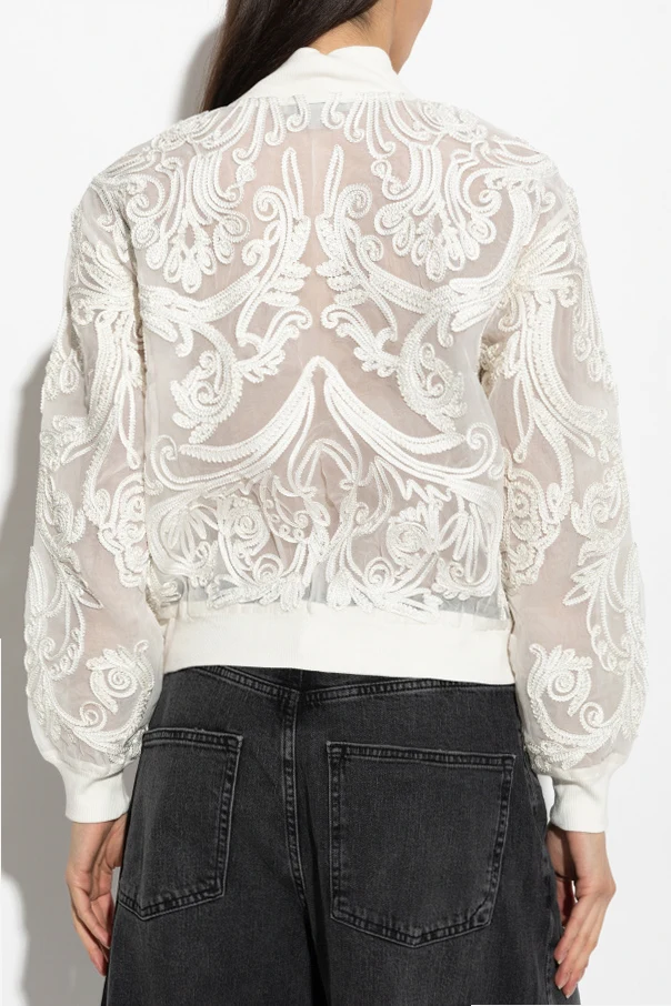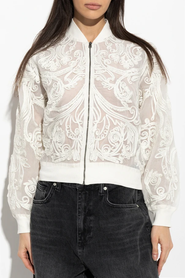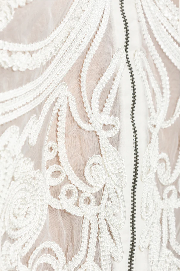 The entire jacket is adorned with exquisite botanical embroidery, intricately stitched across sheer mesh for an alluring, airy effect. Densely placed shimmering beaded appliqués and finely embroidered threads evoke a sense of luxury, while the sumptuous, transparent organza or tulle fabric highlights the jacket’s ethereal character. A sleek metallic front zipper ensures effortless closure, while the absence of visible logos preserves an understated elegance.