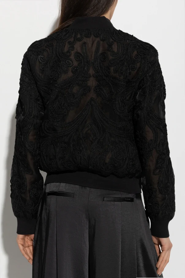 Tailored in a chic, slightly oversized bomber silhouette, it features refined ribbed trims at the collar, cuffs, and hem—for a perfect harmony of structure and movement. The foundation is a whisper-light sheer mesh , which beautifully showcases every embroidered detail. A discreet polished-metal front zipper adds a touch of modern sophistication. The absence of loud prints or logos defines its exclusive, understated elegance.