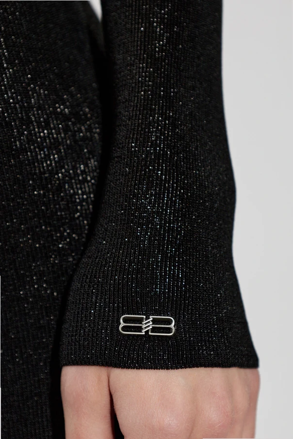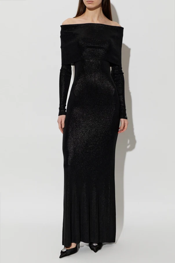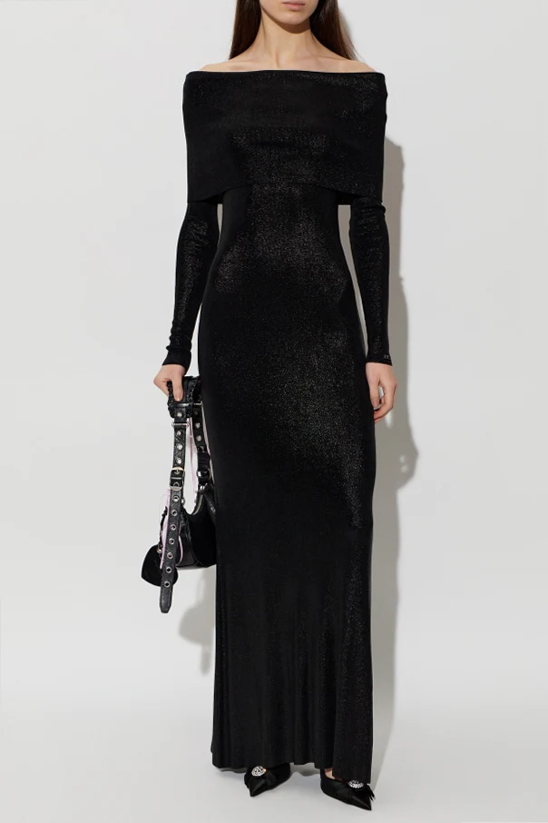 Imbued with refined sophistication, this floor-length turtleneck dress from the exclusive Balenciaga collection envelops the silhouette in exquisite elegance. Crafted from lustrous fabric that gently shimmers with every movement, the form-fitting design graces the figure with effortless allure, while the dramatic off-shoulder neckline elegantly highlights the shoulders. Long, sculpted sleeves complete the minimalist vision, each finished with a subtle metal monogram at the cuff—a discreet tribute to the iconic house.