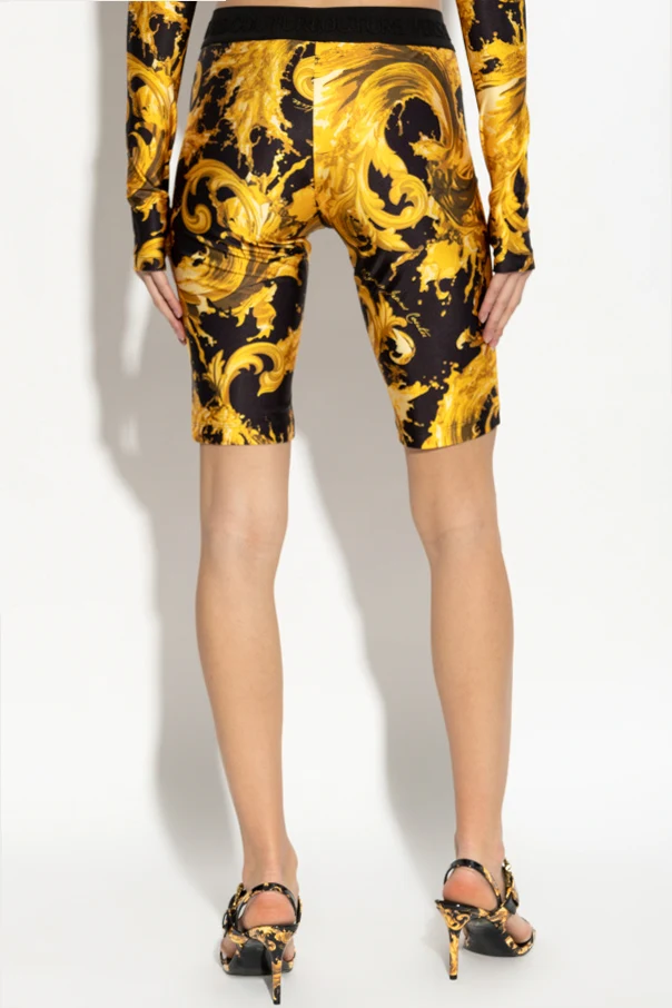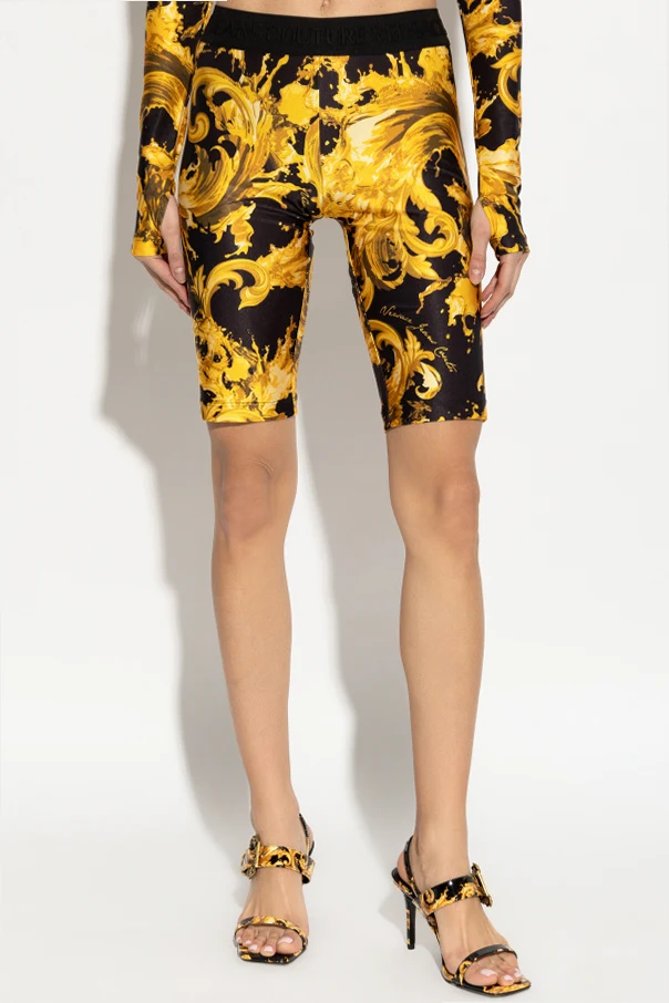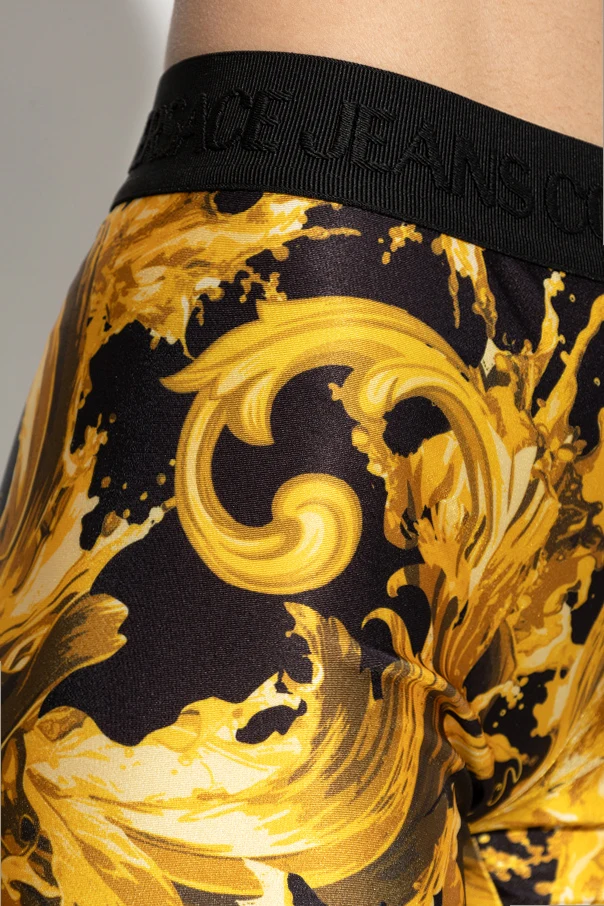 Embodying the fusion of high fashion and modern allure, these classic fitted short leggings by Versace Jeans Couture redefine versatility. Crafted in a sleek, subtly shimmering black fabric, they sculpt the silhouette with refined elegance and exceptional comfort. The pièce de résistance lies in the lavish, gold-ornamental baroque motifs—sumptuous botanical details unfurling across the midnight-black backdrop, creating an opulent yet contemporary aesthetic.