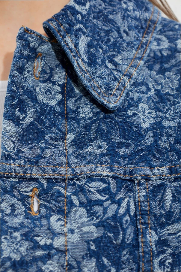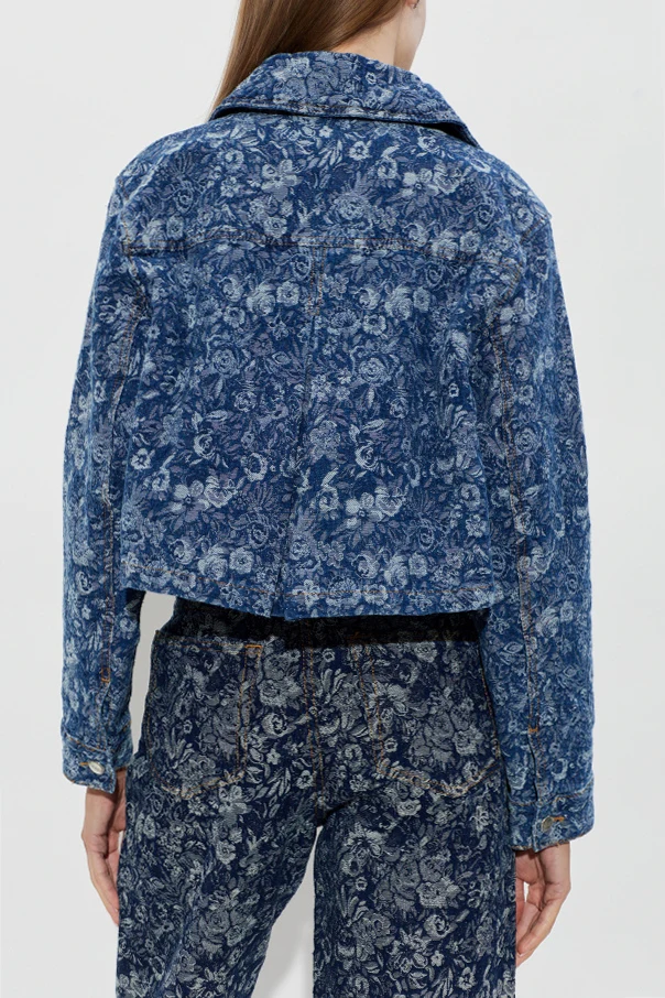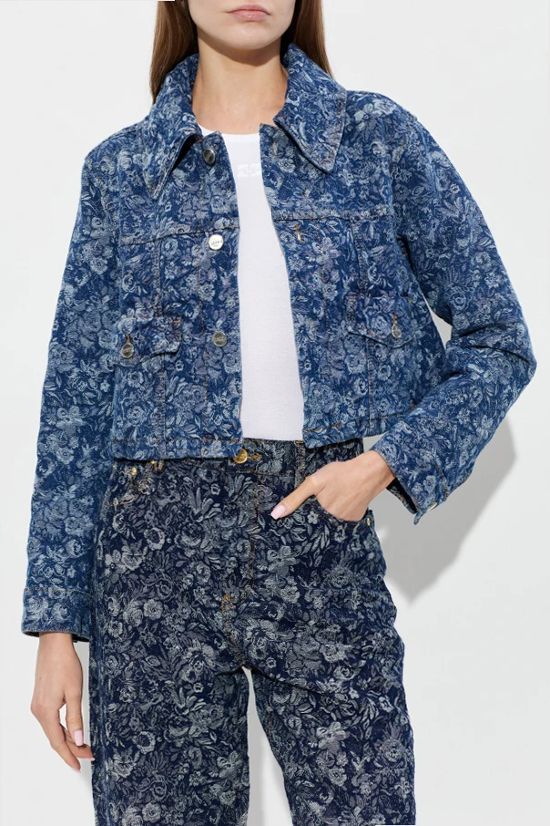 Discover the refined allure of the Ganni Denim Jacket , a contemporary reimagining of a timeless classic. Defined by its subtly boxy, cropped silhouette, this piece graces the waist with effortless poise. The generously rounded collar and bold silver-toned buttons offer a nod to iconic design, while the standout floral motif—rendered in sophisticated shades of blue and navy—infuses the sturdy denim with an exquisite jacquard-like texture.