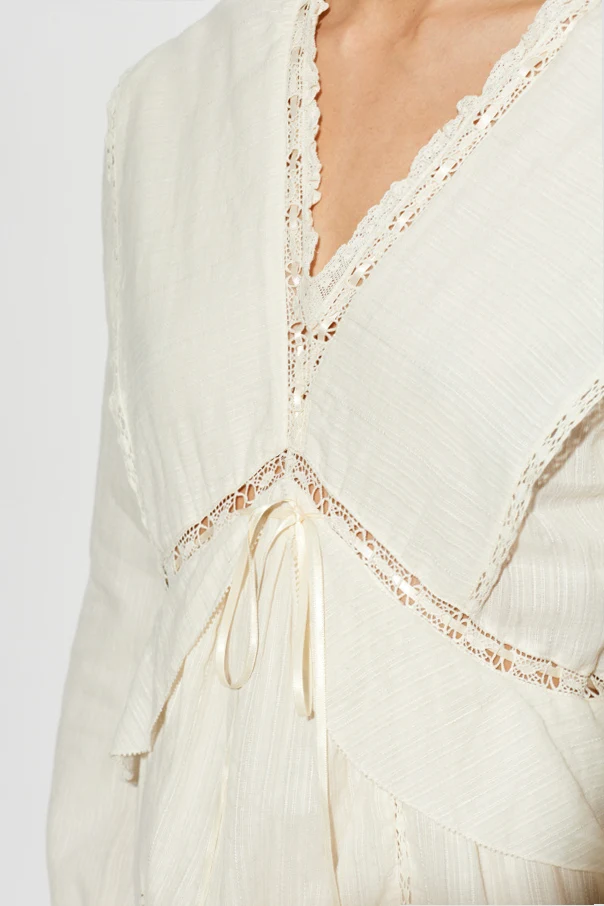 The deep V-neckline is artfully accentuated by intricate openwork lace and is complemented by a softly rounded back yoke, both meticulously edged with fine lace for a touch of subtle sophistication. Crafted from an airy blend of cotton, linen, and viscose, the fabric showcases a refined vertical texture and a graceful matte sheen.