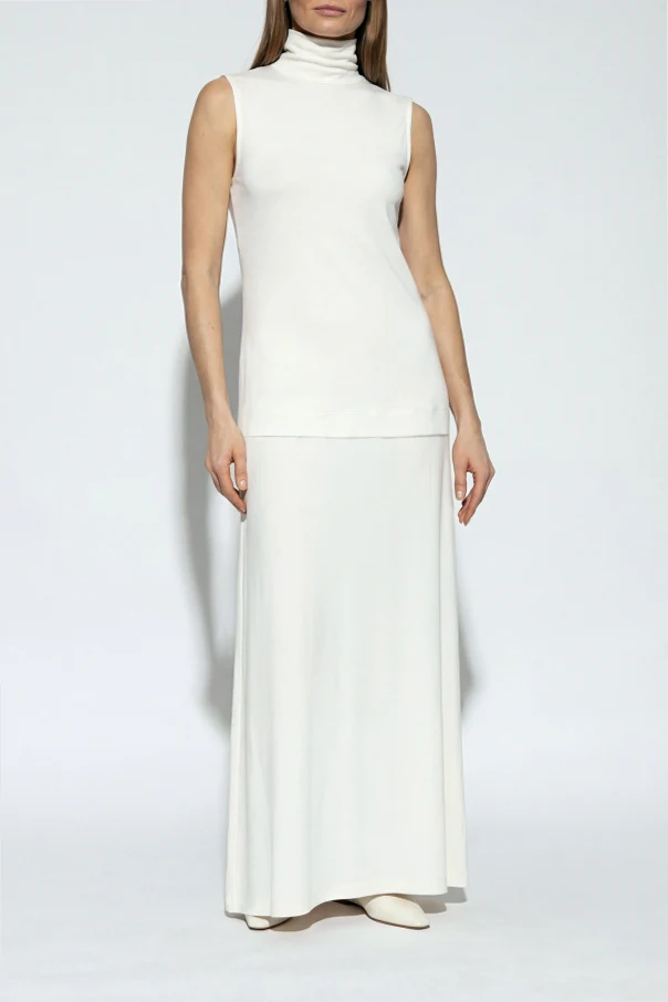 Experience refined sophistication with this sleeveless maxi dress in pristine white by renowned designer Jil Sander . Meticulously tailored from a supple, high-quality fabric, its smooth, non-sheer texture envelops the silhouette with graceful lightness. The dress features a flawlessly fitted upper bodice with a high, sculpted turtleneck, evoking modern minimalism while softly elongating the neckline.