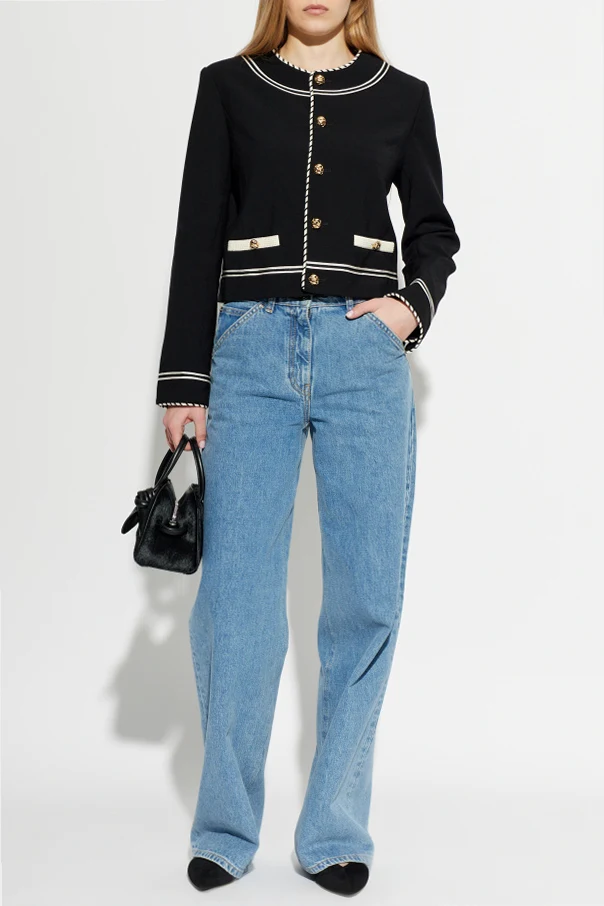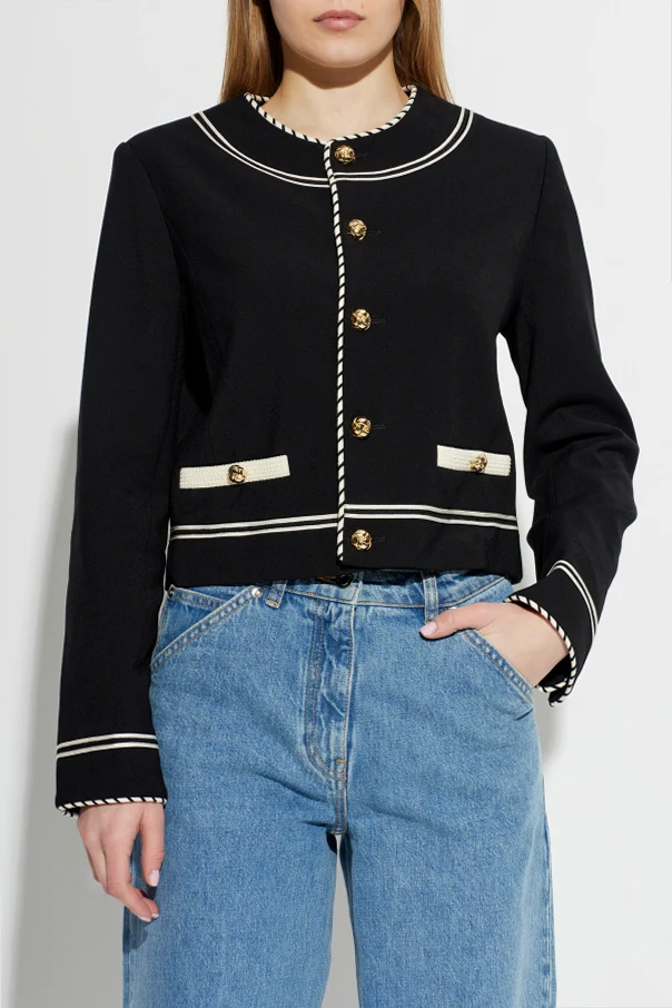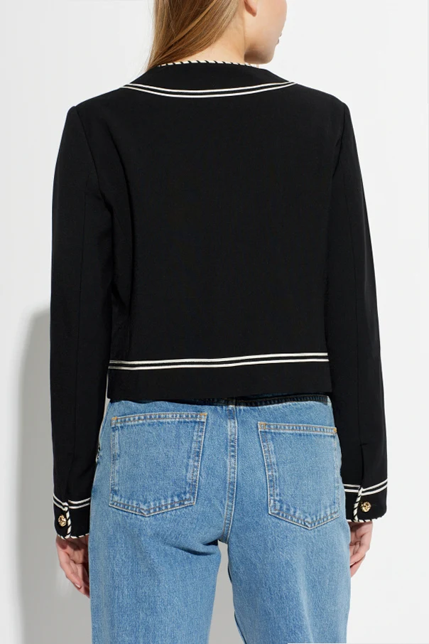 Exuding a refined aesthetic, this FRAME Black Tailored Blazer captivates with understated elegance. Crafted from an exquisite blend of viscose, polyamide, and elastane, the smooth black exterior is beautifully accented with sharp, contrasting white piping along the edges, cuffs, hem, and pockets. A classic, round-neck silhouette without lapels and impeccably fitted shape offers a modern, sophisticated profile, while long, straight sleeves embody timeless grace.