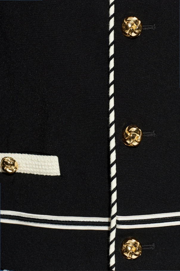 The design is elevated by two front waist pockets, each adorned with luminescent gold decorative buttons and sleek, light horizontal trims. Five ornate gold buttons with distinctive motifs secure the front closure, providing both function and artful ornamentation. Every element, from the intricate stitching to the luxurious internal lining, attests to FRAME's commitment to premium craftsmanship and unique detailing.