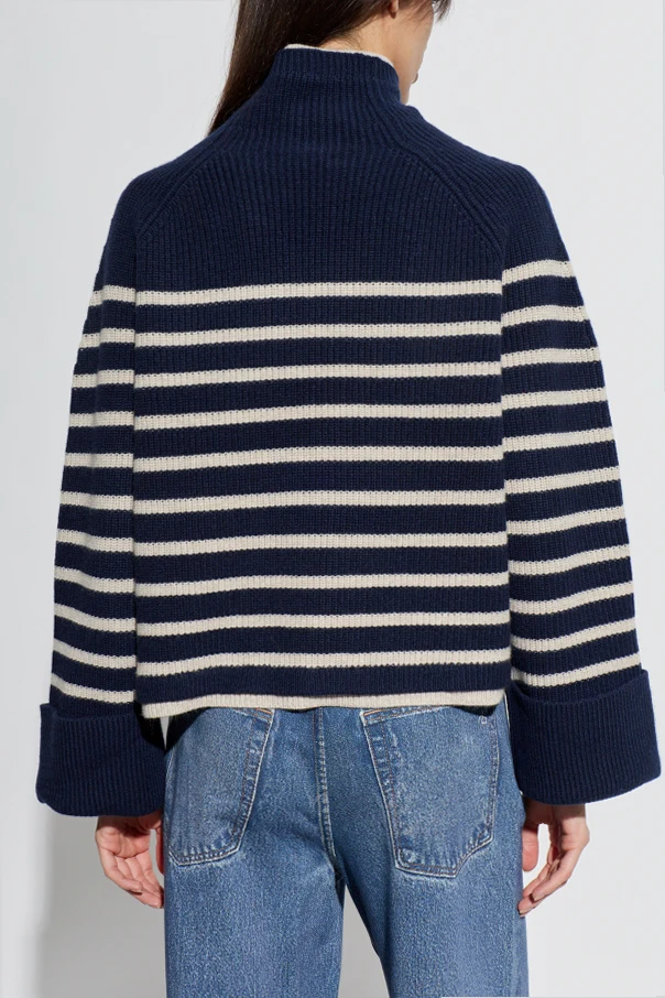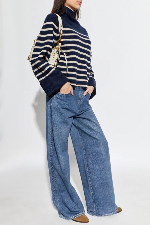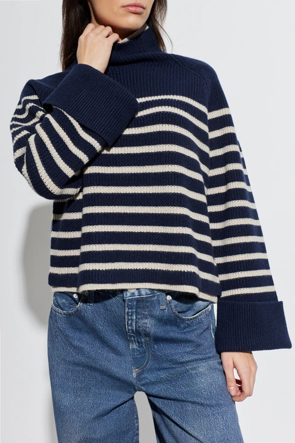 Experience understated luxury with this navy and cream turtleneck sweater from Rag & Bone. Crafted from sumptuous, robust wool, its loose, subtly boxy silhouette is artfully complemented by dropped shoulders and generously wide sleeves, finished with exquisite rolled cuffs. The refined, tall turtleneck features a simple, structured knit—resolutely unadorned for a tastefully minimalist effect. Broad cream stripes elegantly traverse the navy background, creating a harmonious, horizontal pattern across the body and sleeves, while the shoulder area and upper turtleneck remain smoothly solid, enhancing the piece’s modern allure. Free from logos and embellishments, this sweater epitomizes quiet sophistication and versatile warmth. Why choose this product? Exclusive design by Rag & Bone, renowned for elevated American-British casual style Luxurious, heavyweight wool ensures exceptional comfort and lasting quality Distinctive boxy fit with wide sleeves and elegant rolled cuffs Classic navy base with expertly placed cream stripes for a timeless yet striking look Meticulous, minimalist finish—perfect for discerning wardrobes
