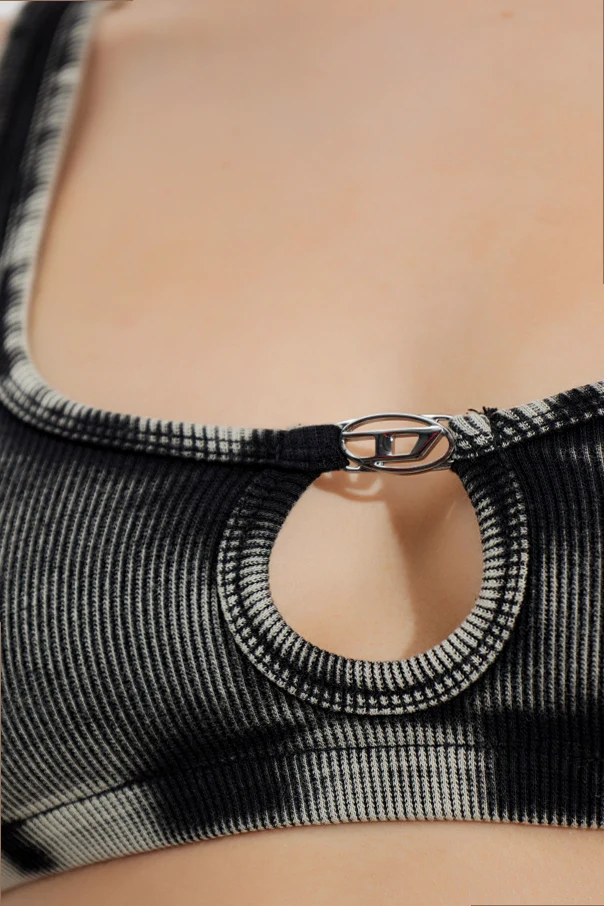 Discover the remarkable FLORENCE-DNM bralette by Diesel, an epitome of understated sophistication and contemporary flair. Crafted from a luxuriously soft and ribbed blend of cotton and elastane, this piece gently embraces your silhouette, ensuring comfort with a subtly supportive fit. The design features a sporty turtleneck-inspired cut , wide straps, and a strikingly open, wide back band for a modern edge. Its unique, worn-in gray hue evokes a refined denim effect, gracefully accentuated by light tie-dye edges. The round cutout just below the neckline, adorned with a silver-toned metal accent, offers a distinctive focal point, while tonal stitching speaks to meticulous craftsmanship. Devoid of overt branding, the FLORENCE-DNM bralette effortlessly elevates every ensemble with quiet luxury. Why choose this product? Innovative ribbed material for exceptional comfort and flexibility Artful, washed gray denim look with subtle tie-dye detailing Signature metal embellishment for a distinctive touch Uncompromised Diesel quality and modern design Elegantly seamless—a perfect balance of style and versatility