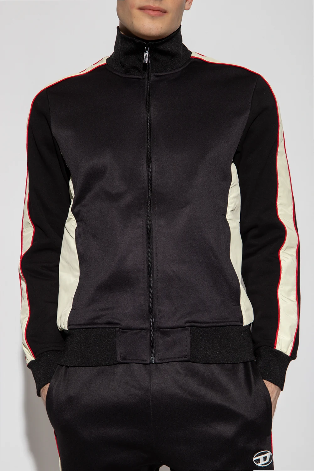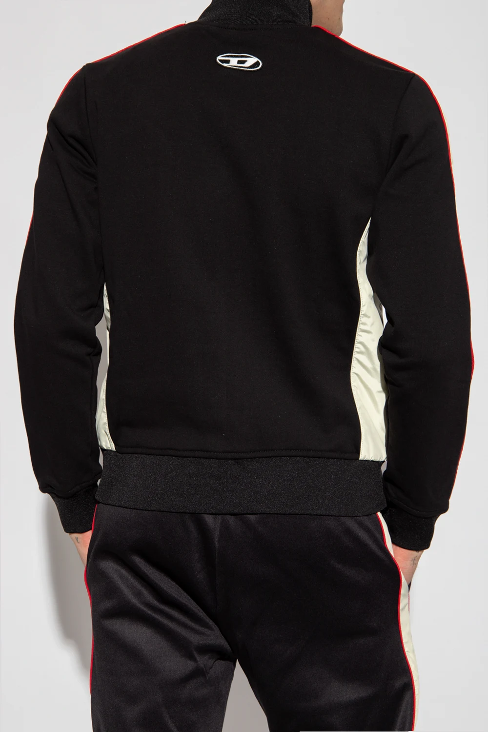 Black 'S-BLOCKER' sweatshirt with a standing collar from Diesel. Emblazoned with a black and white logo patch at the back, this style features a zip fastening, cream and red taping on the sleeve and sides, two zip pockets and elasticized edges.
