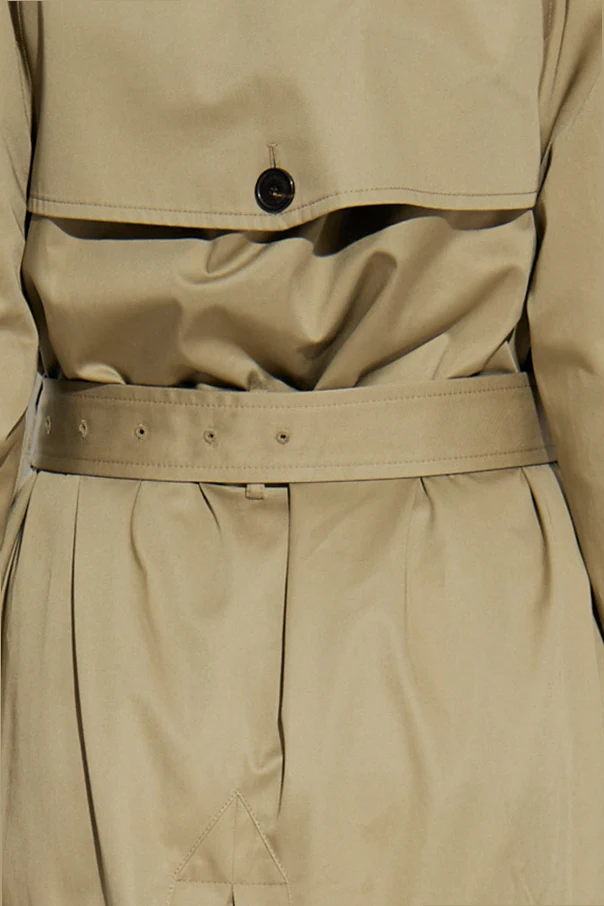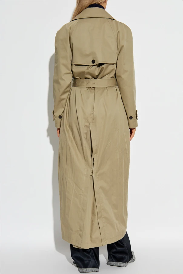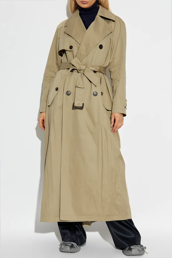 Elevate your outerwear collection with the Double-Breasted Trench with Belt by Balenciaga . Presented in an exquisite green hue, this trench exemplifies timeless sophistication with its relaxed silhouette and architectural, knee-grazing length. The expert tailoring features a classic double-breasted closure with striking black buttons, while a matching fabric belt cinches the waist for a refined, feminine profile.