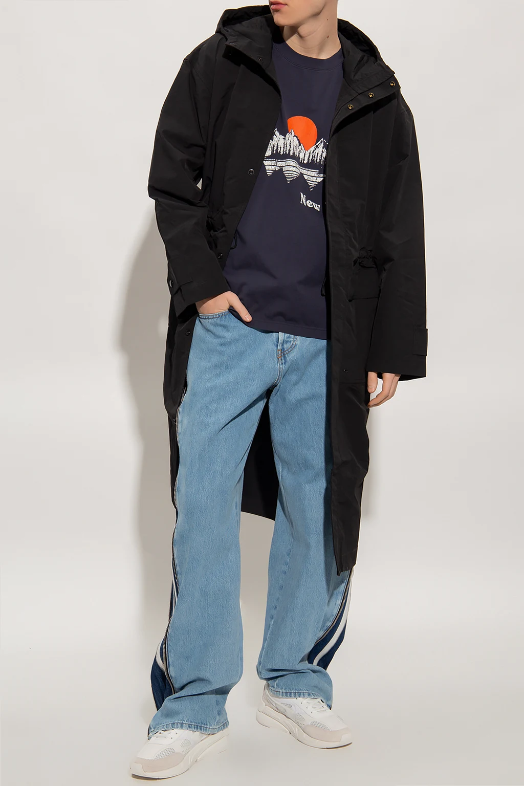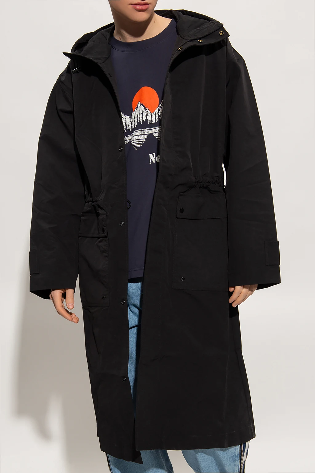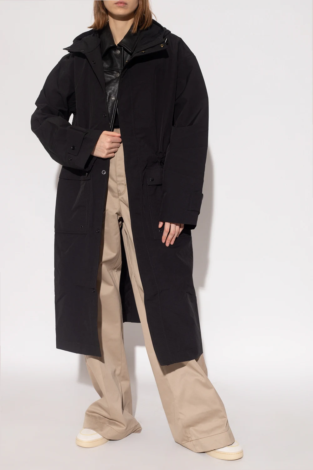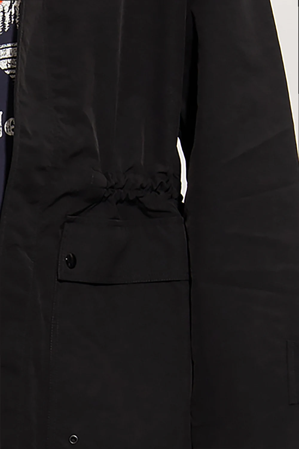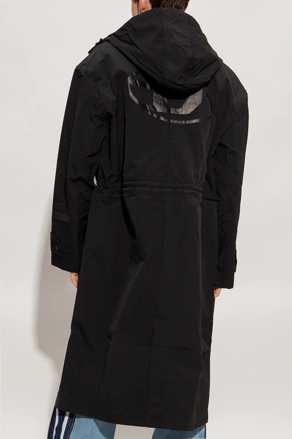 Black hooded ‘J-Lui’ coat from Diesel. Made of recycled polyamide with an anti-bacterial treatment, this garment features snap fastenings with a concealed placket, drawstring waist, two front pockets, two snap-fastened flap pockets, black logo print and drawstring hood.
