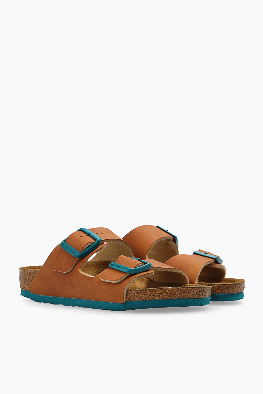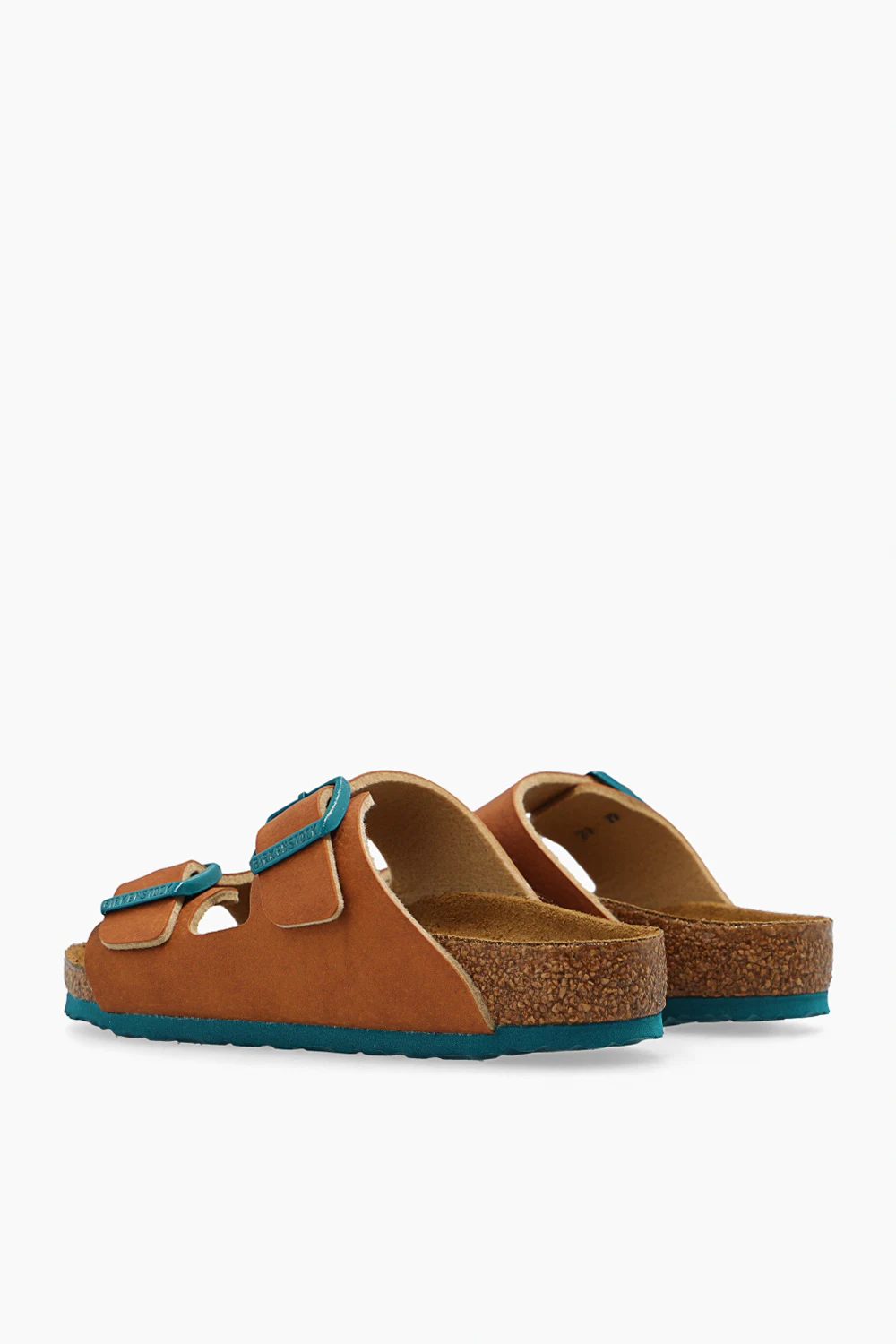 Brown ‘Arizona BS’ slides from Birkenstock Kids. Made with Birko-Flor®, this model sits on a brown cork sole trimmed with blue EVA foam and features an embossed logo and adjustable straps with blue buckles.