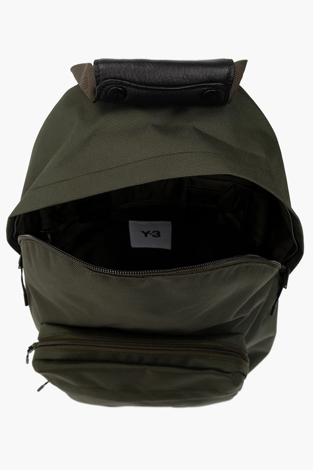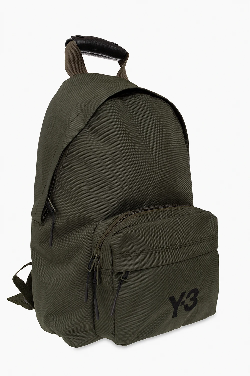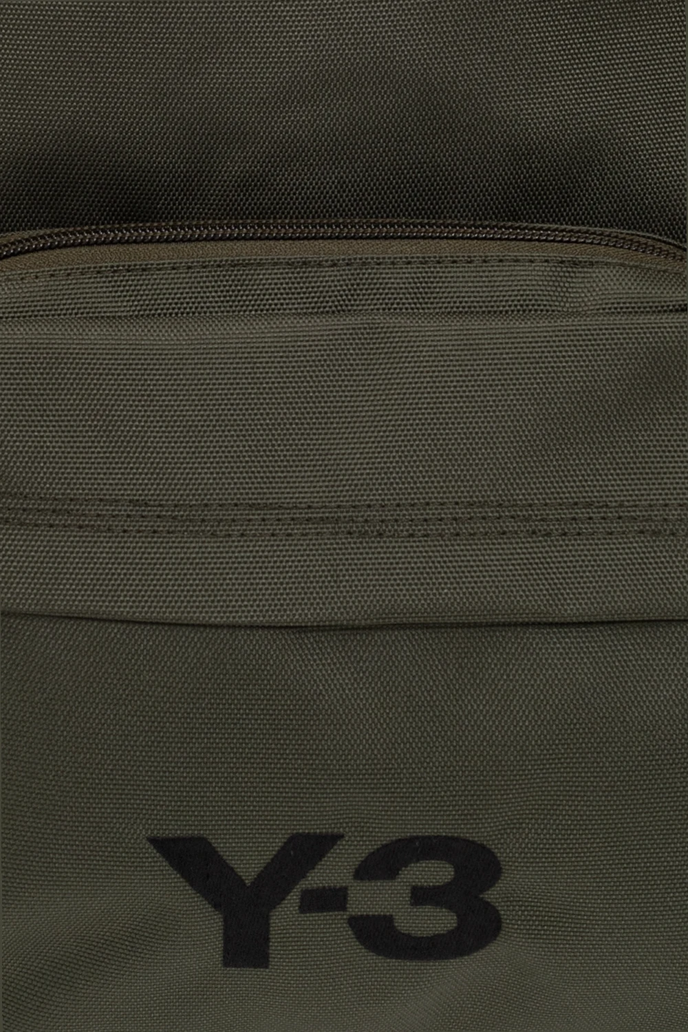Dark green backpack from Y-3 Yohji Yamamoto. Embroidered with a black logo, this design features a two-way zip fastening, two zip pockets on the front, black faux-leather trimming, a half-round handle, adjustable shoulder straps and one internal compartment with one velcro-fastened pocket, one zip pocket and one slip pocket.