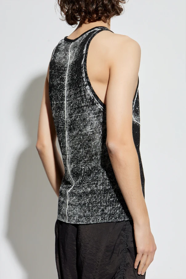 The K-RICK-O Top by Diesel epitomizes the essence of contemporary sophistication. Crafted from premium linen, this sleeveless tank top boasts a classic silhouette with generous armholes and a round neckline, ensuring a universally flattering, unisex fit. The fabric features an artfully distressed knit, enhanced by lustrous metallic threads that lend a subtle, vintage-inspired shimmer. Striking white lines—one vertical front stripe intersected by two diagonal ones forming an inverted “Y”—expertly contrast the deep black hue, creating a refined focal point. The back is accented by a single, elegant white line running down the center. A distinguished, embroidered "D" emblem—an iconic mark of Diesel—adorns the chest, affirming the top’s unmistakable pedigree. Why choose this product? Exquisite linen fabric for breathable comfort and natural elegance Unique, shimmering knit with a vintage sheen Bold, modern patterning for standout style Signature Diesel craftsmanship and iconic detailing Timeless, gender-inclusive design