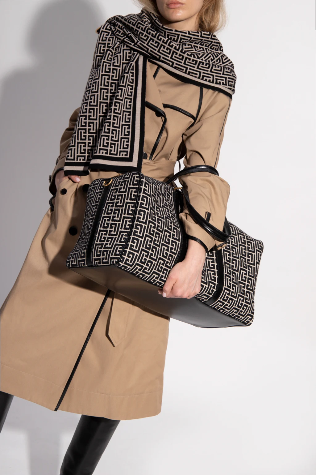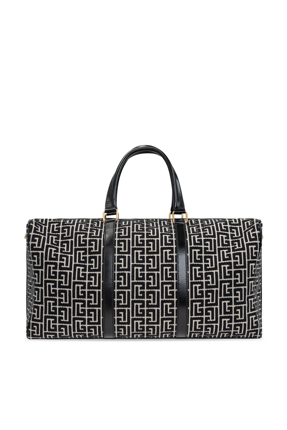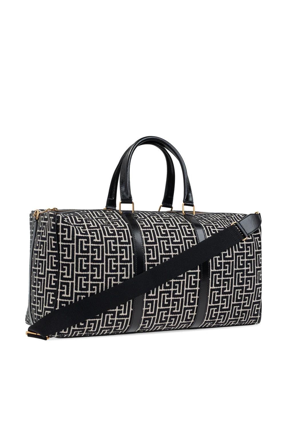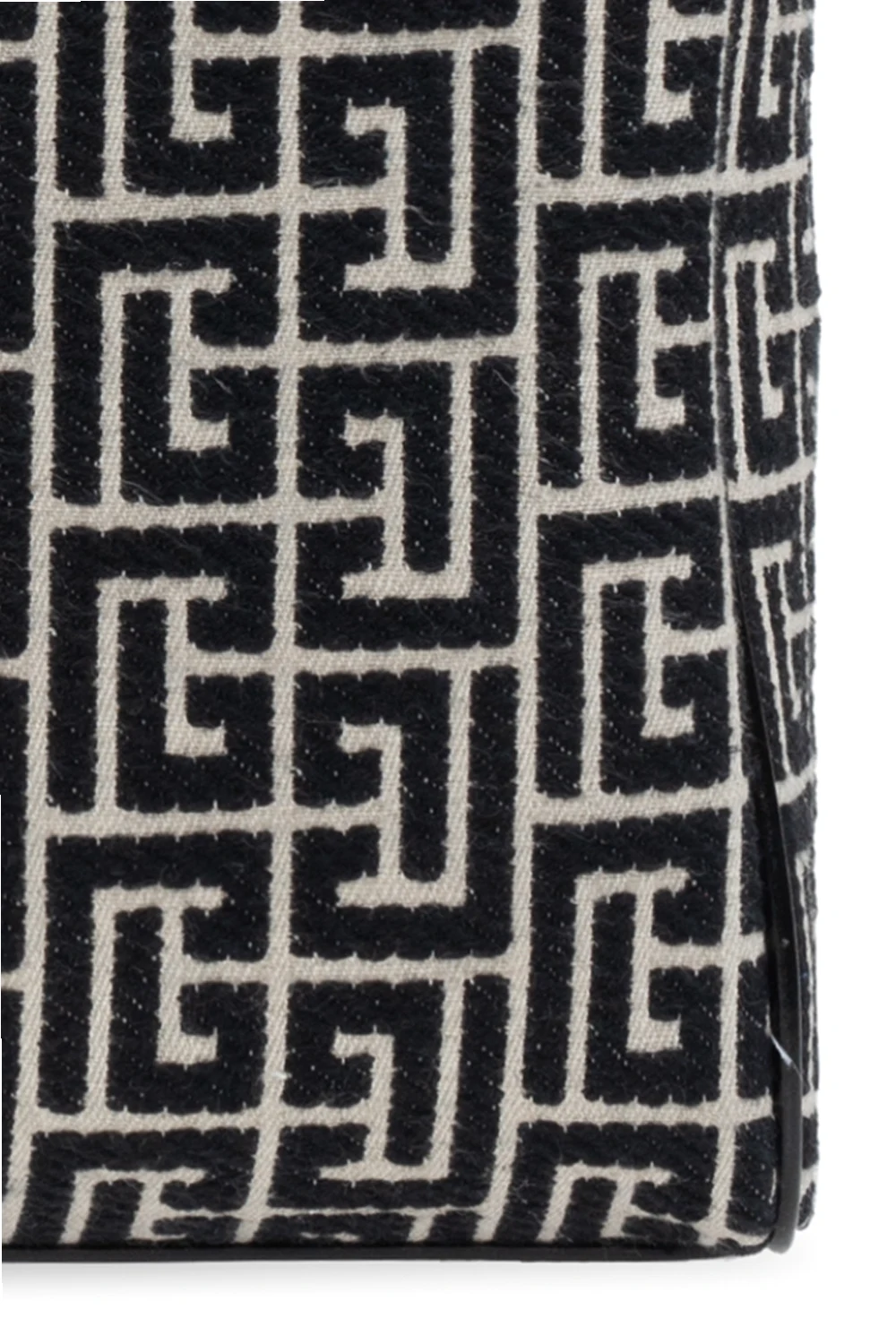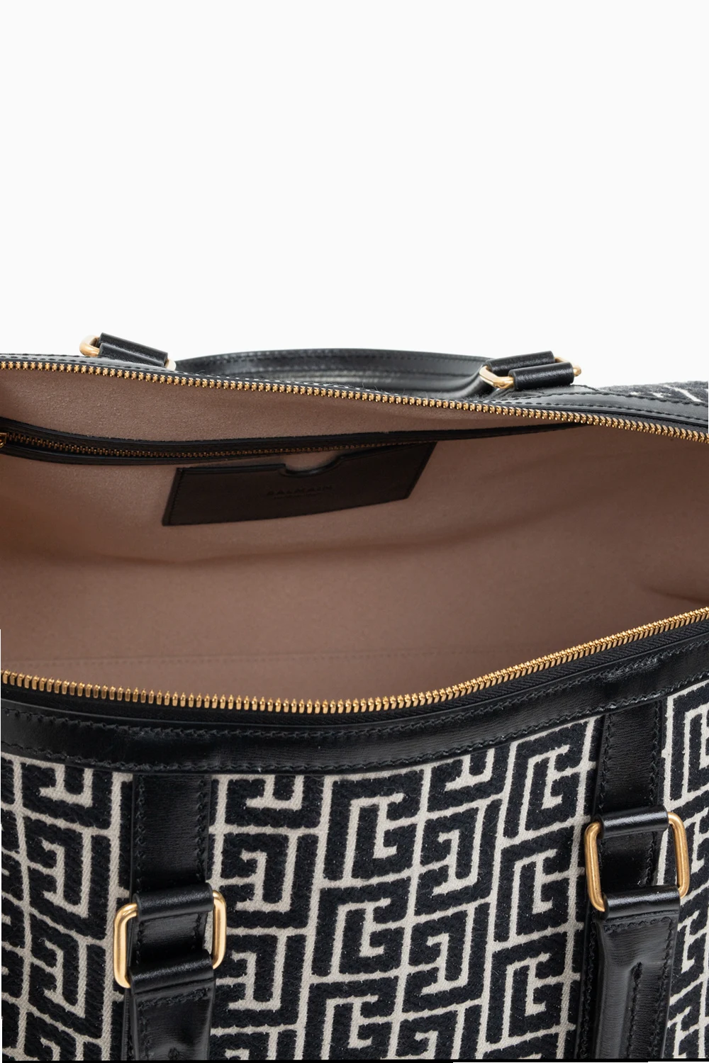 Black and cream ‘Boston’ hand bag from Balmain. Made of cotton with leather trims, this model fastens with a zip and is enriched by an embroidered logo pattern. It is complete with two half-round handles, detachable and adjustable shoulder strap, gold-tone metal hardware and one internal compartment with one zip pocket and one card slot.