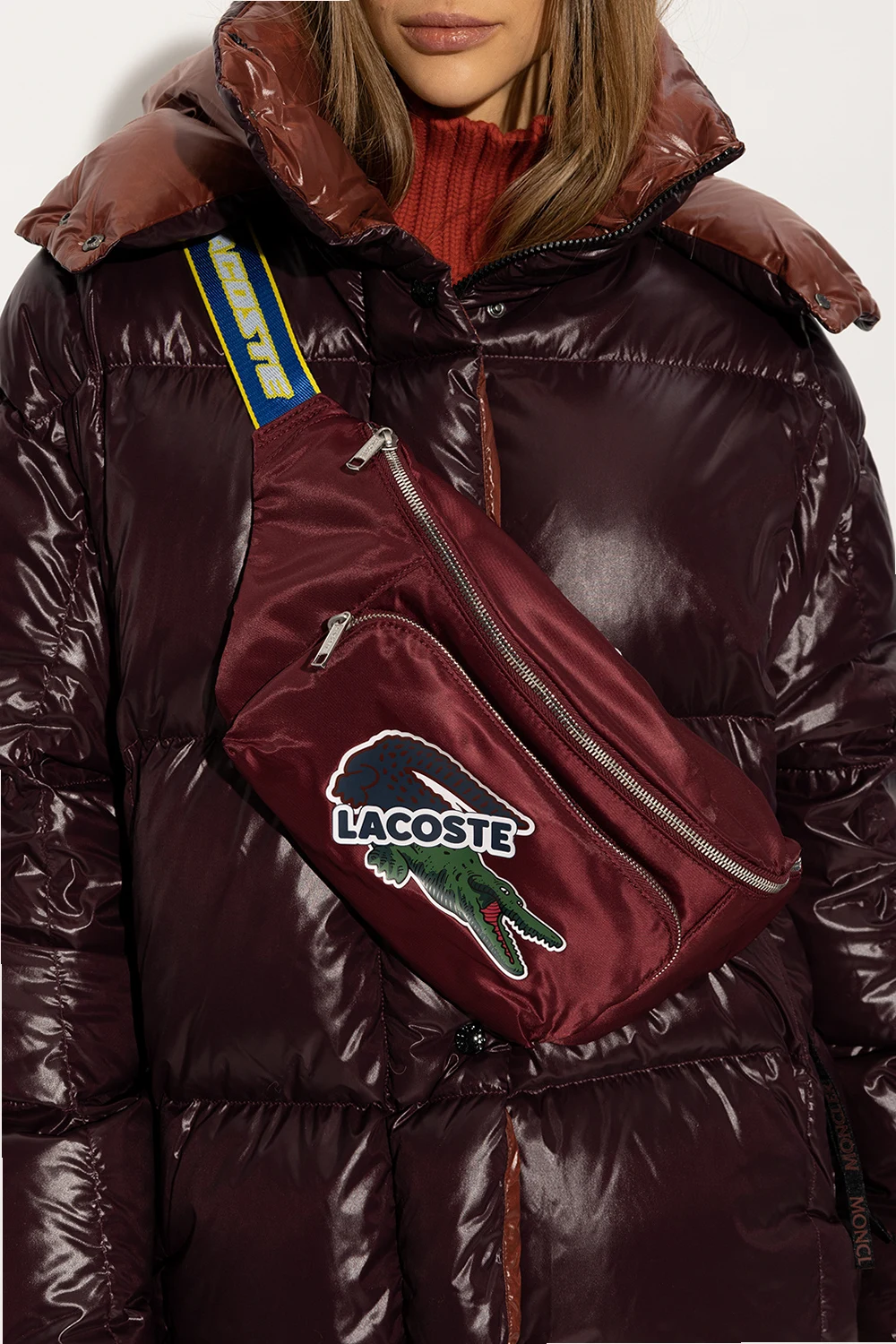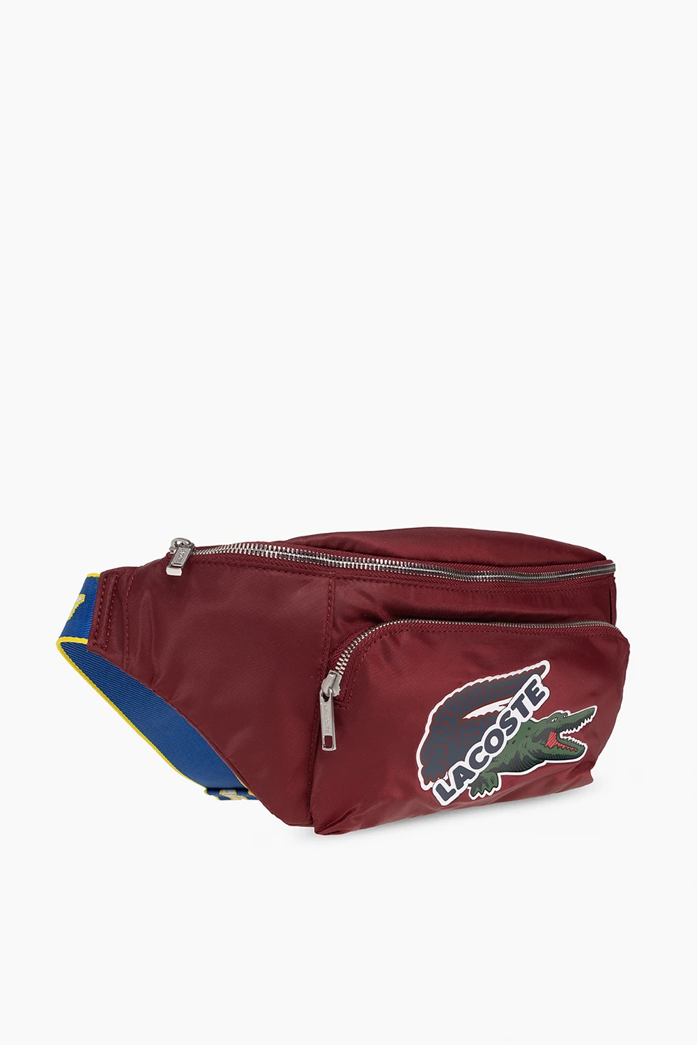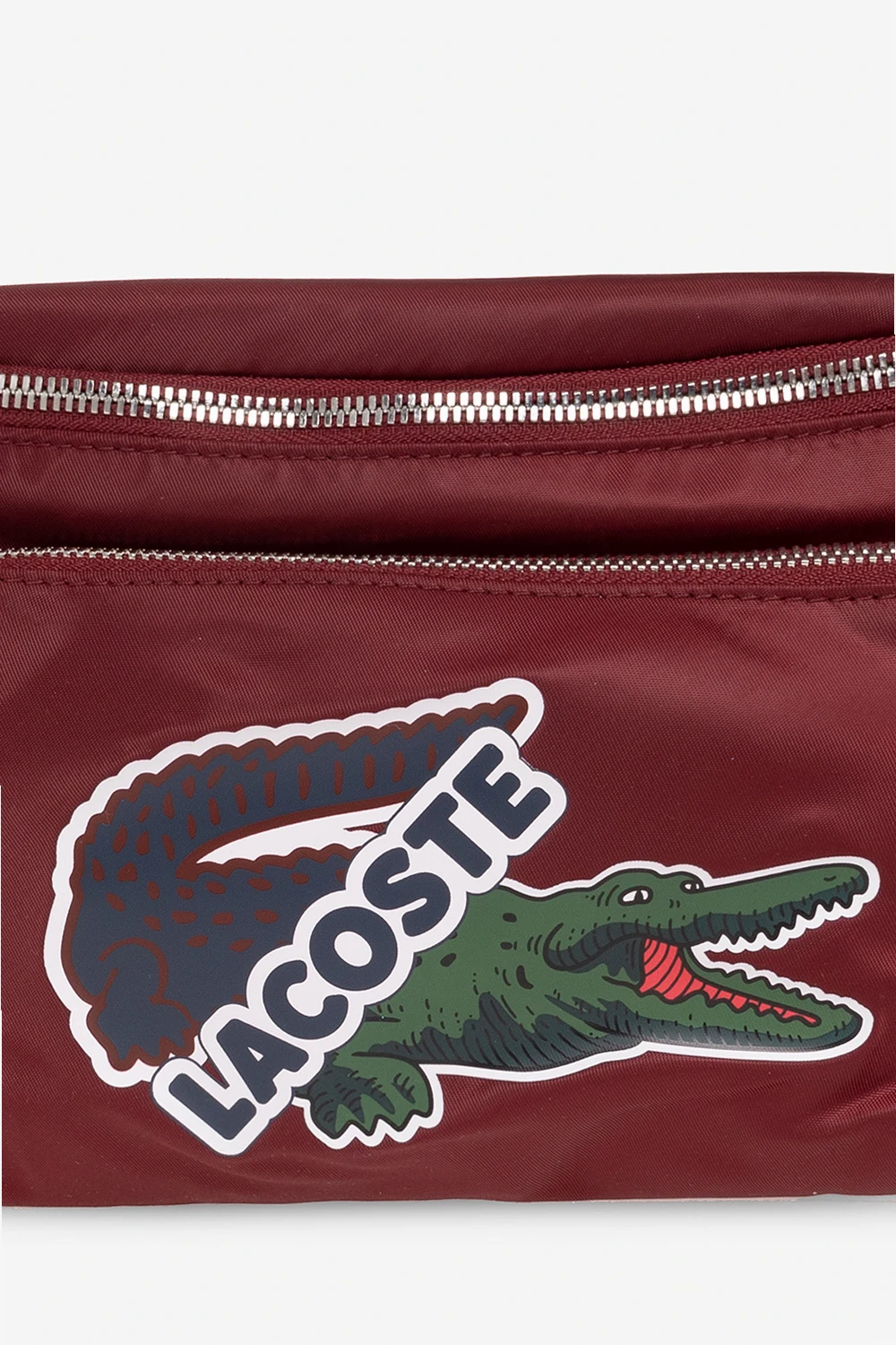 Maroon shoulder bag from Lacoste. Made of partly recycled fabric with a shiny finish, this model fastens with a zip and is decorated with a logo print. It is complete with a front and back zip pocket, dark blue and yellow adjustable shoulder strap, silver-tone metal hardware and one internal compartment with one zip pocket.
