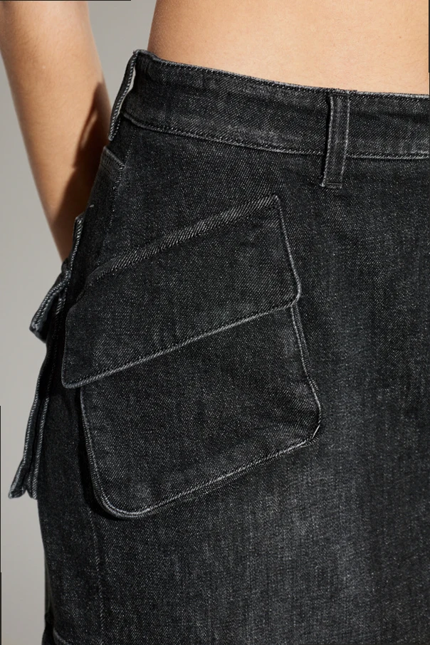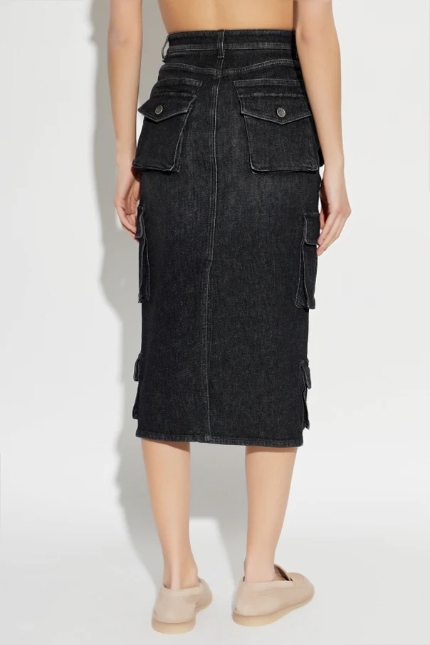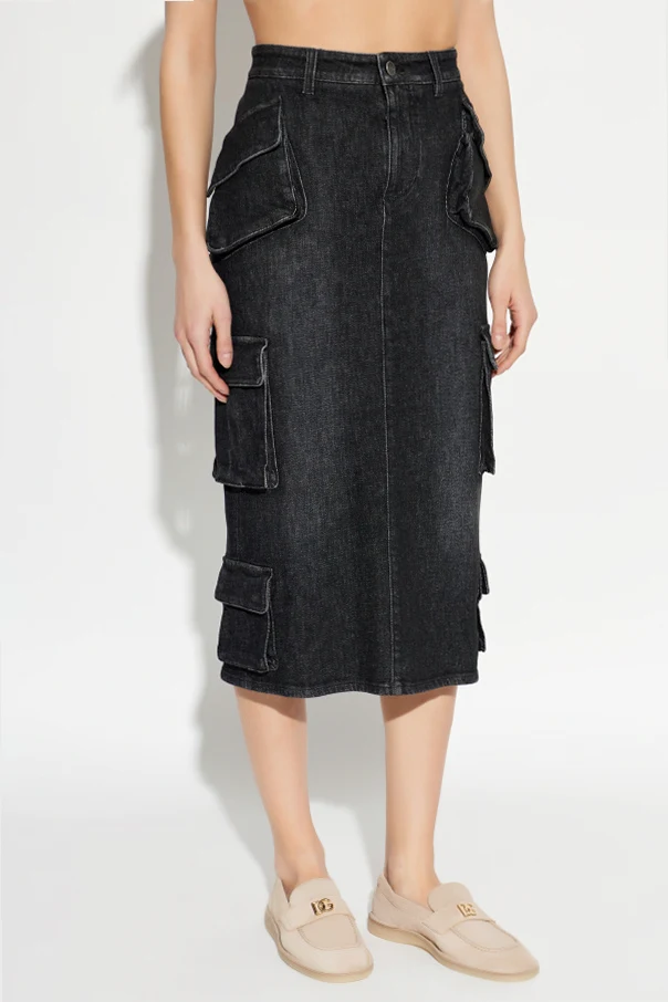 The design is distinguished by its immaculate simplicity—free from prints or ornamental stitching—highlighting the exquisite fabric and precise tailoring. Signature cargo-style pockets, generously sized with flaps and thoughtfully placed at the hips and sides, lend a subtly utilitarian charm and practical elegance to the skirt.