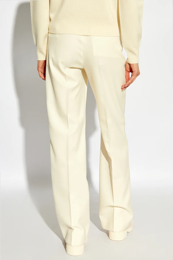 Discover the refined allure of these Beige Creased Trousers from Moncler , exquisitely crafted to evoke timeless sophistication. Rendered in smooth virgin wool, the trousers feature a classic creased front and a fluid, straight-leg silhouette—a testament to effortless elegance. Their high-rise profile complements the softly tailored look, while an elastic waistband with a modern drawstring and polished stoppers ensures both comfort and adjustability.