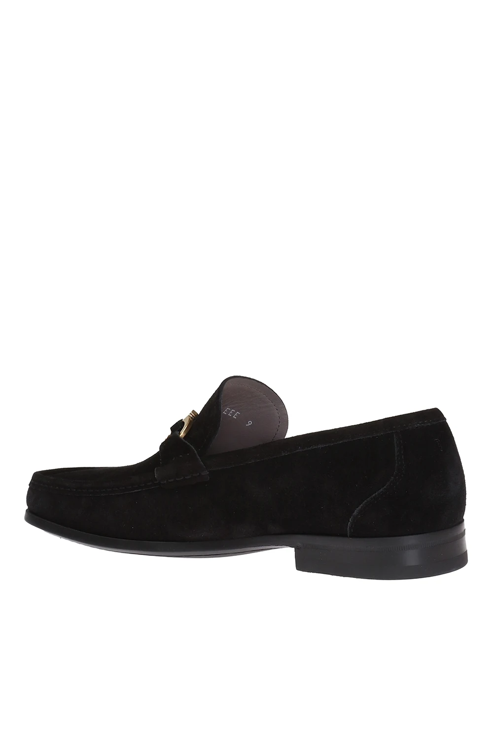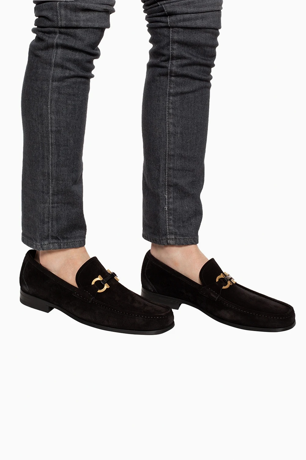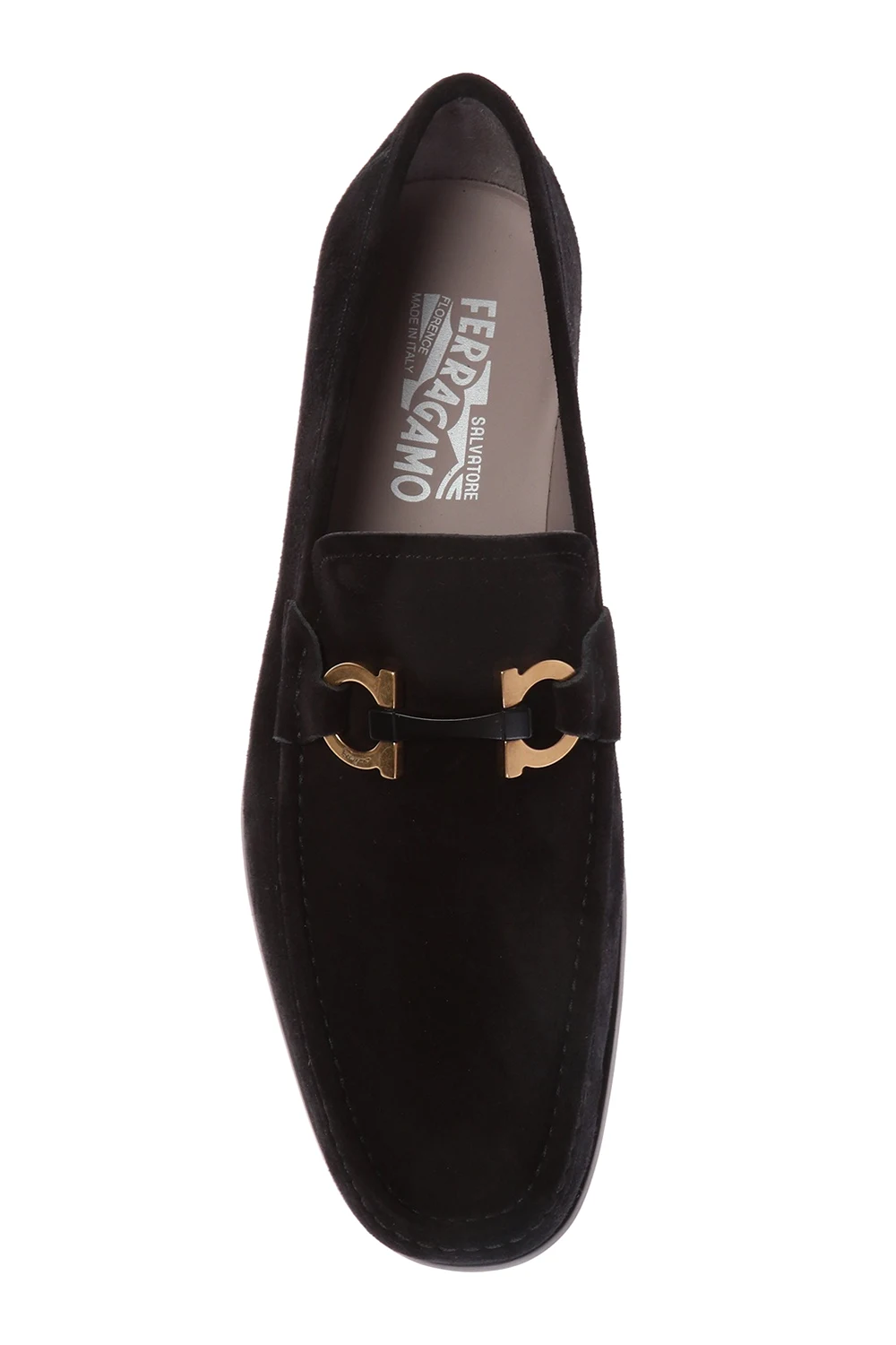 Black 'Grandioso' loafers from Salvatore Ferragamo. Made of suede. Logo-embossed metal elements in black and gold-tone on the front. Black rubber sole.