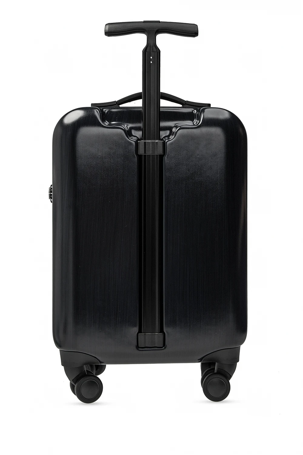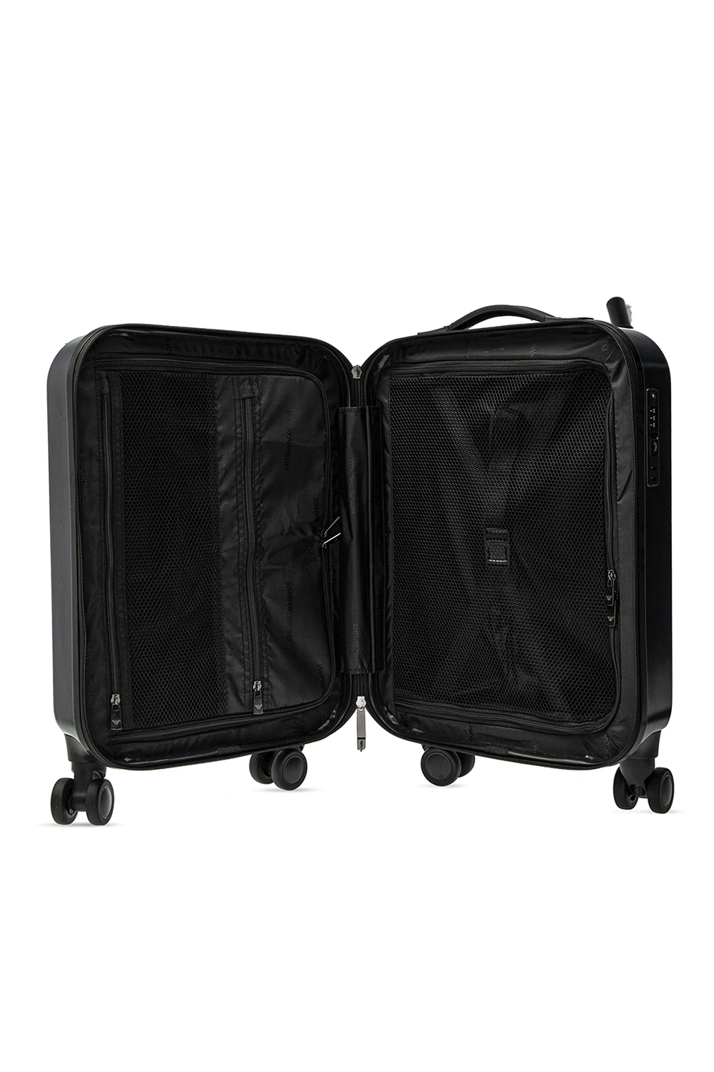 Navy blue suitcase from Emporio Armani. Designed for long travels, this sturdy valise is fastened via combination lock and detailed with tactile logo of the brand, a half-round handle, a retractable telescopic handle, four rotating wheels as well as interior with two compartments and two zip pockets inside.