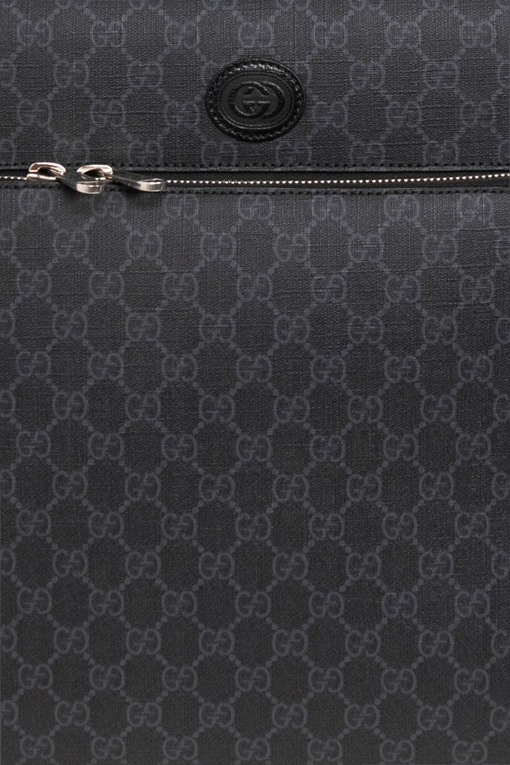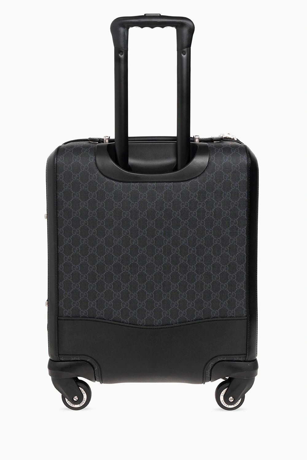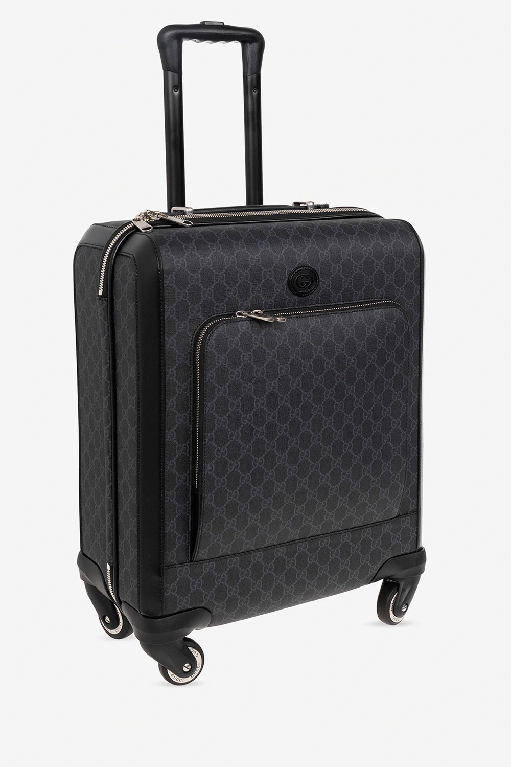 Black suitcase on wheels from Gucci. Crafted from canvas and leather, this model features a two-way zip, GG monogram pattern, patch, front zip pocket, half-round handle, two internal compartments and silver-tone metal hardware.