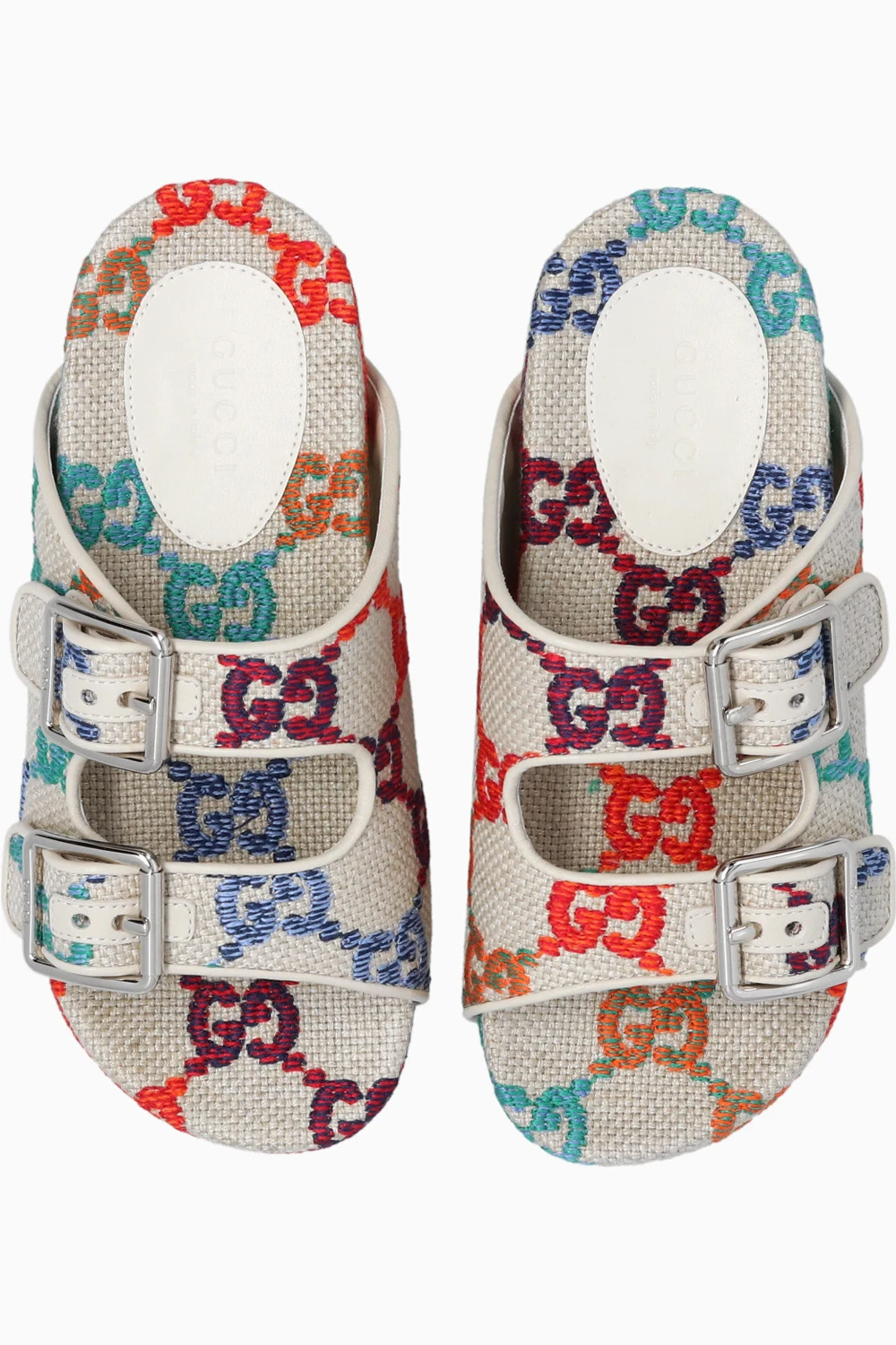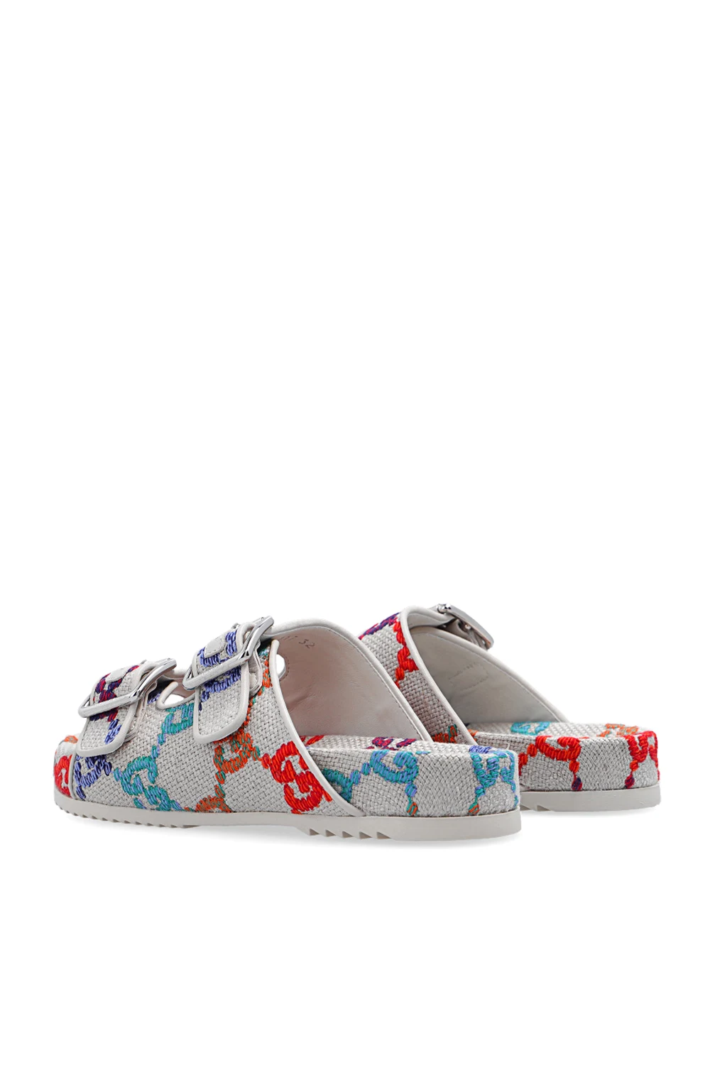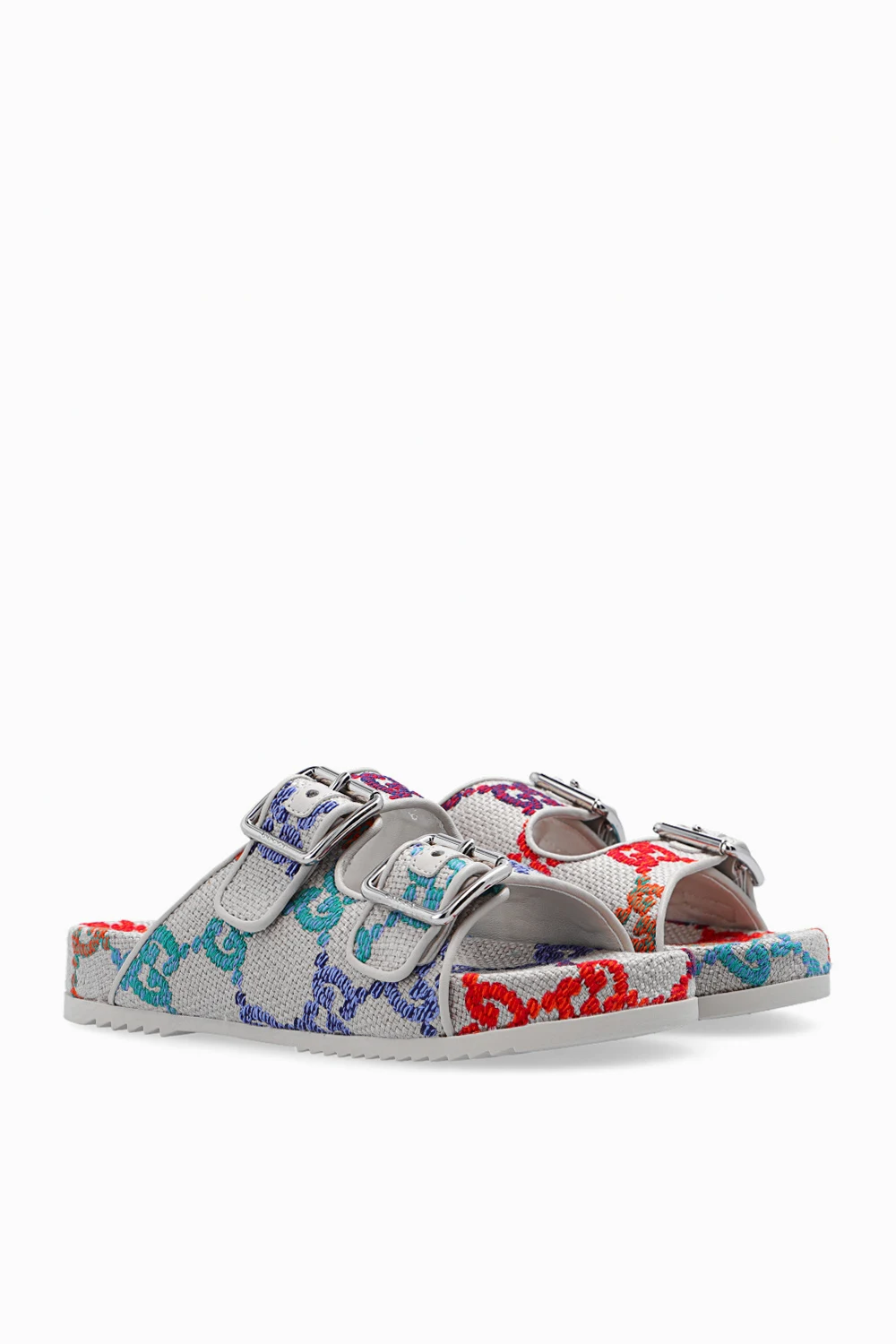 Beige slides from Gucci Kids. Made of linen canvas, this pair features two straps with silver-tone buckles, multicolored embroidered GG monogram pattern and beige rubber sole.
