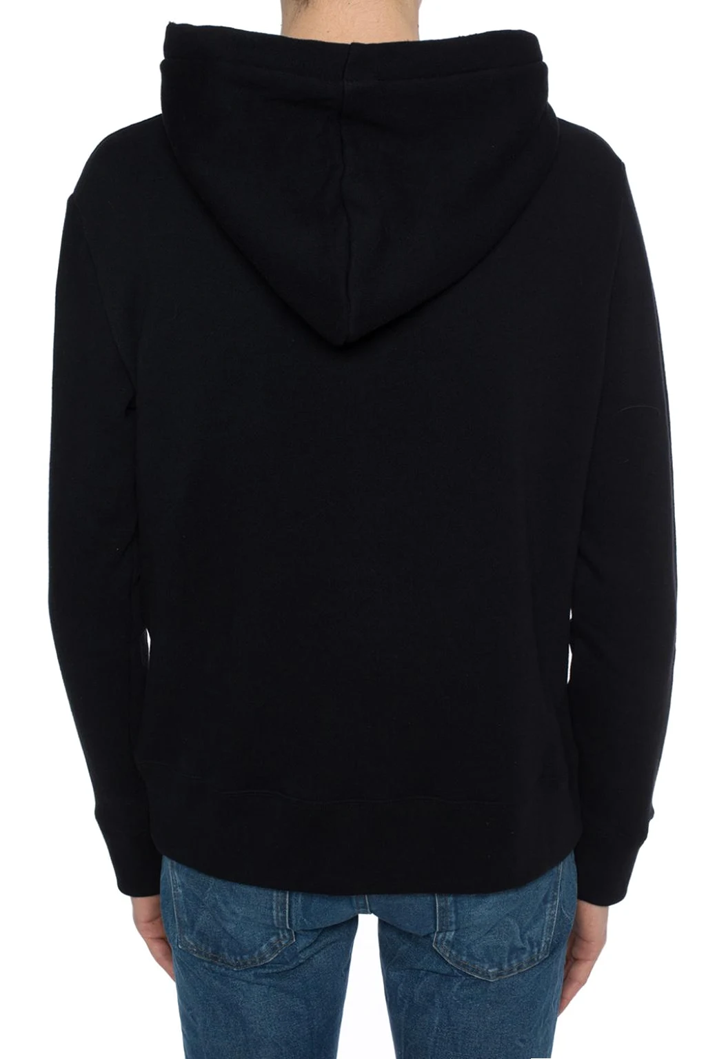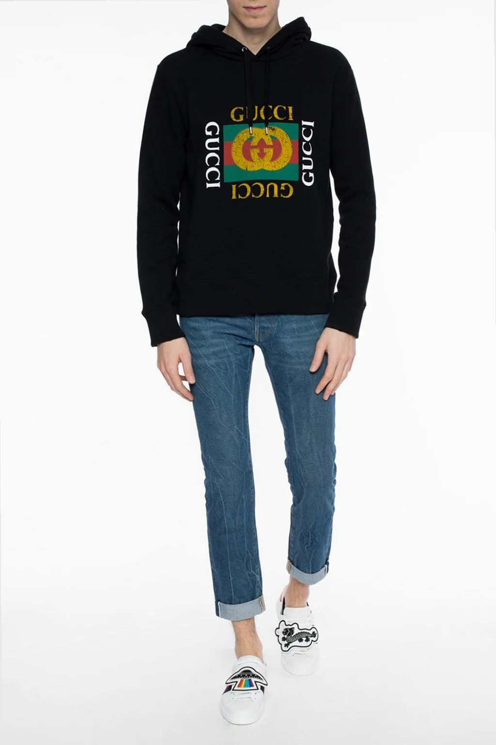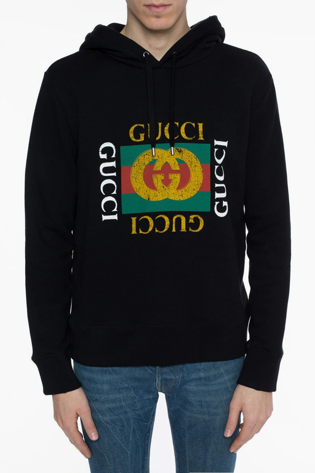 Black sweatshirt with a drawstring hood from Gucci. Made of cotton. Embellished with green-red-green 'Web' stripe motif with logo. It features a ribbed bottom hem and cuffs.