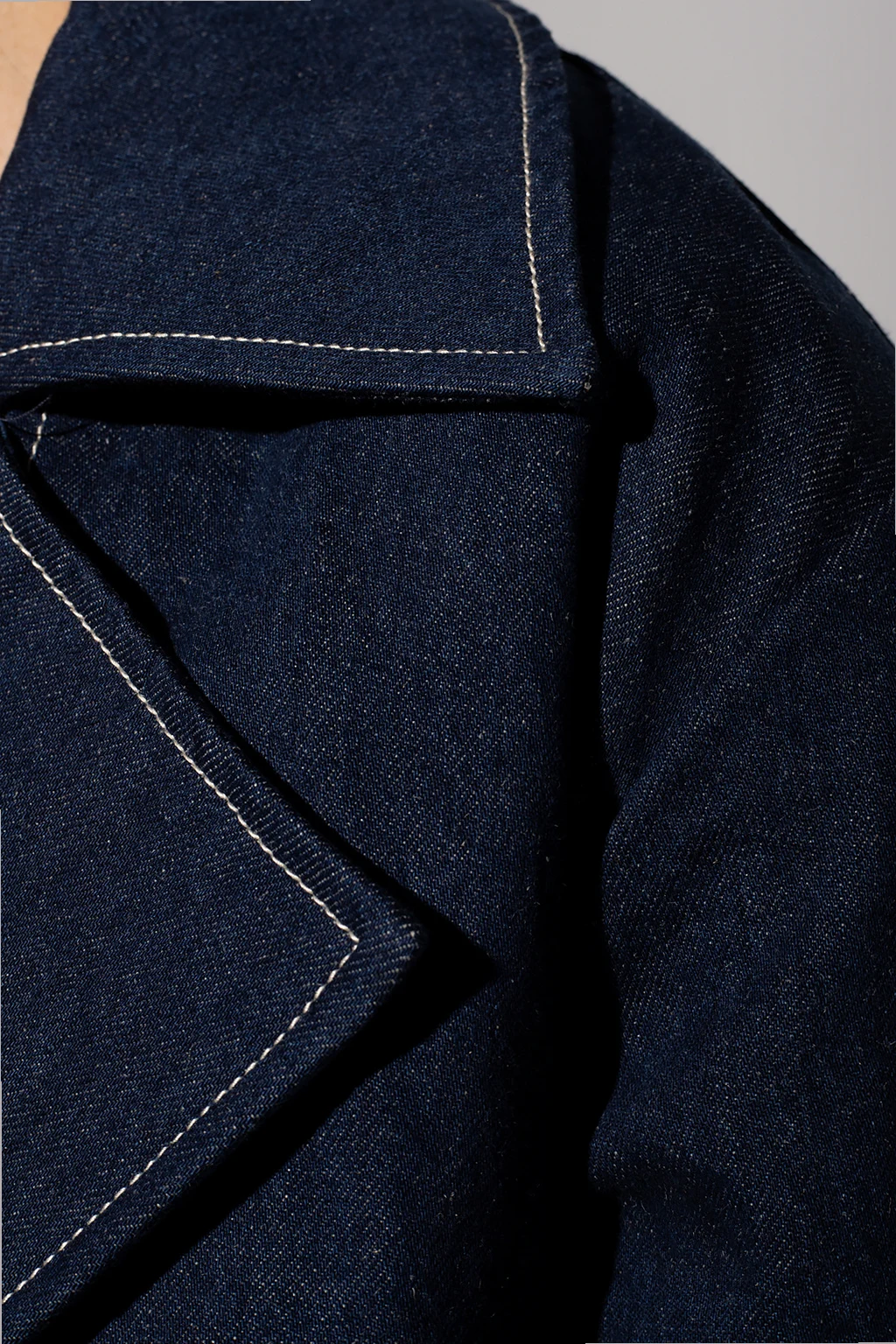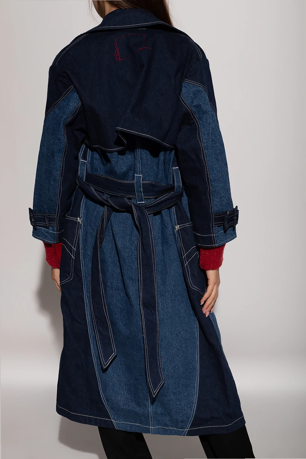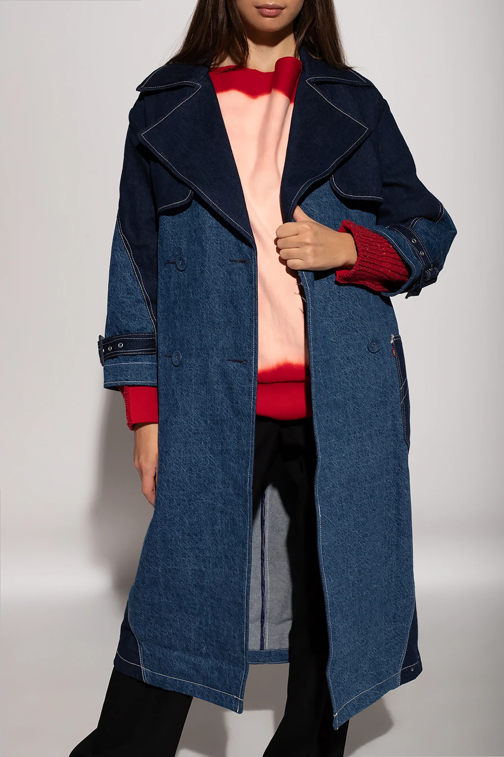 Navy and blue double-breasted denim trench coat from Levi’s, the ‘Red’ collection. Crafted from Italian Cottonized Hemp for a reduced environmental impact, this garment features button fastenings, a tie belt, cream stitching details, two slip pockets and long sleeves with buckles.