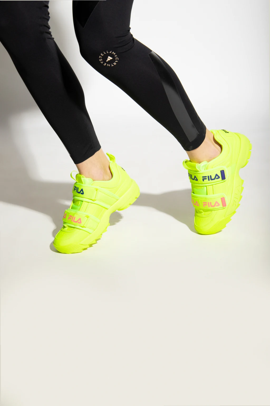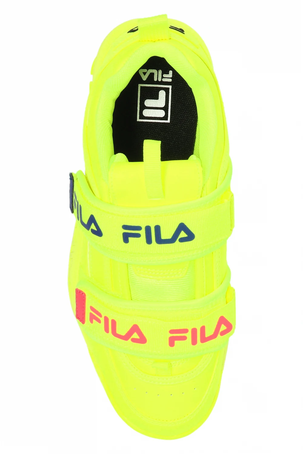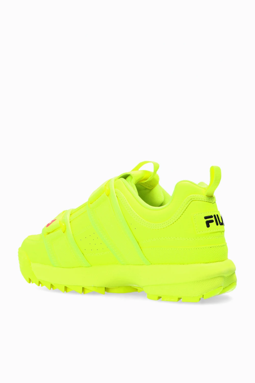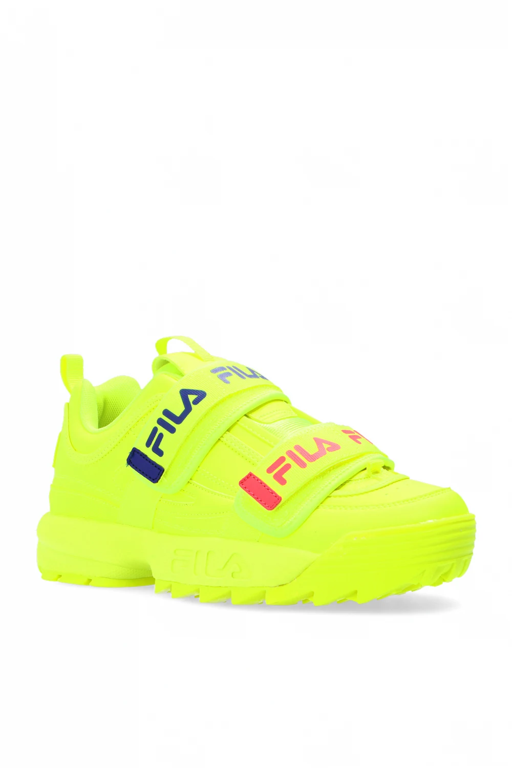 Neon yellow ‘Disruptor Straps’ sneakers from Fila. Fastened with logo-printed velcro straps, this design features perforations on the sides, grosgrain pull strap for an easy on & off and neon yellow rubber tread sole.
