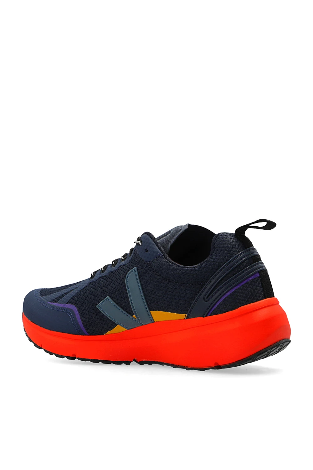 Navy running shoes from VEJA x Ciele. Produced from recycled materials, this lace-up pair features TPU panels, navy V logo, heel support insert made of Pebax® and rubber sole in orange and black.